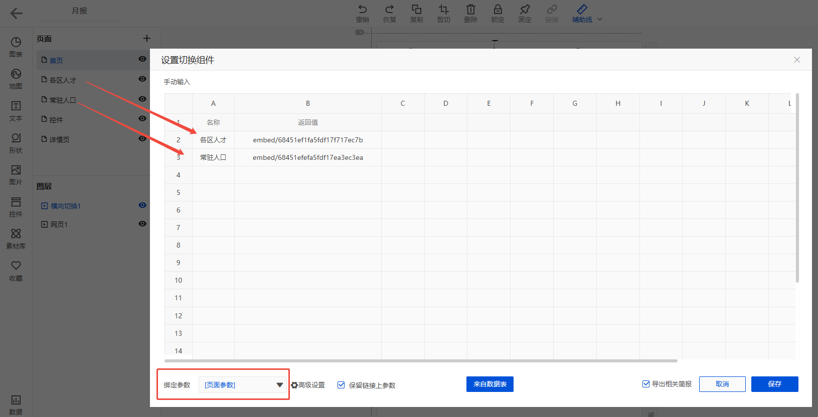 4. 编辑横向组件显示内容和返回页面链接>选择绑定参数>勾选保留链接上参数。