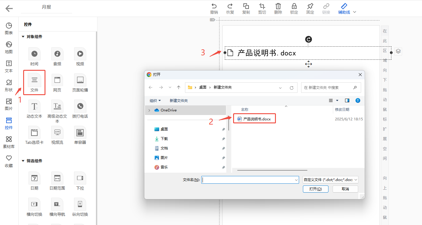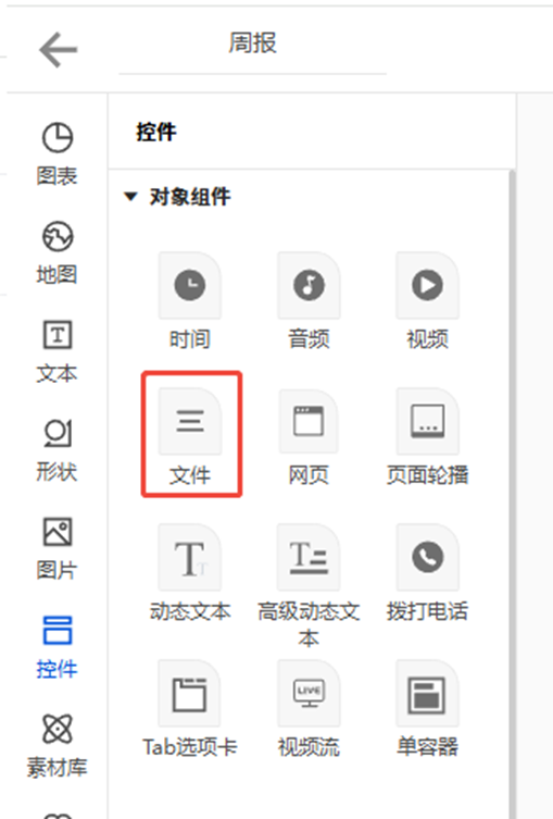 控件 > 文件 > 单击 > 选择添加的文件 > 打开。