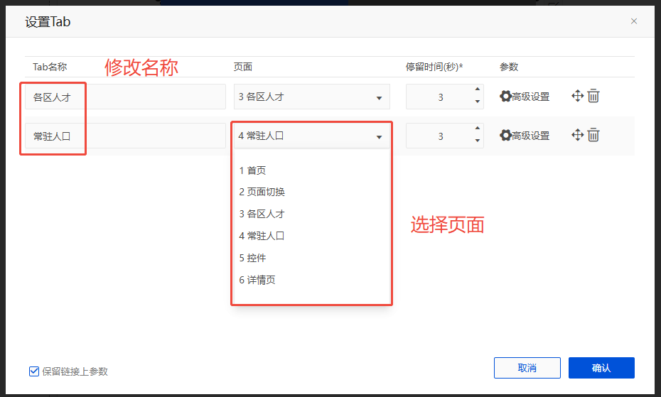2. 编辑数据,为各 Tab 选择页面,并命名 Tab 标签名称。