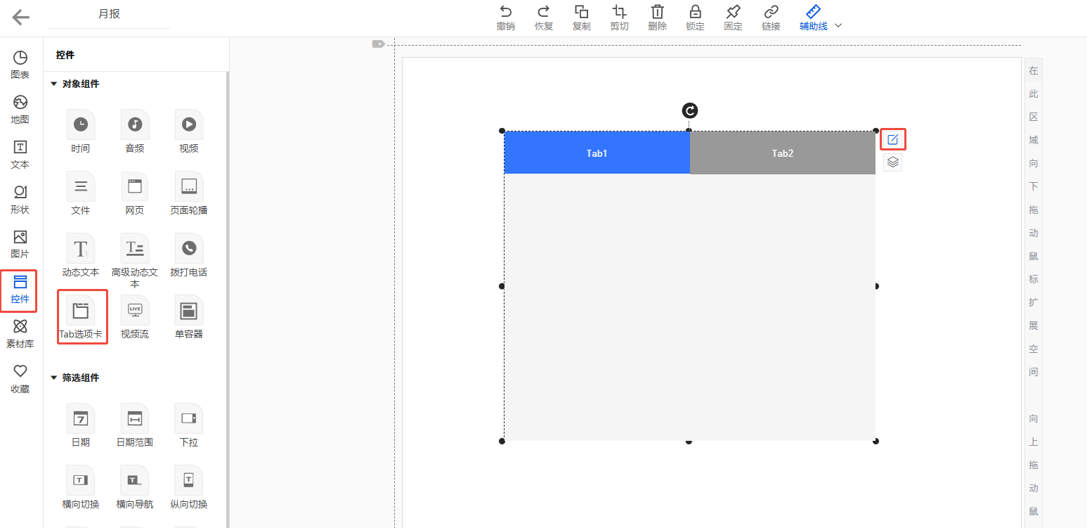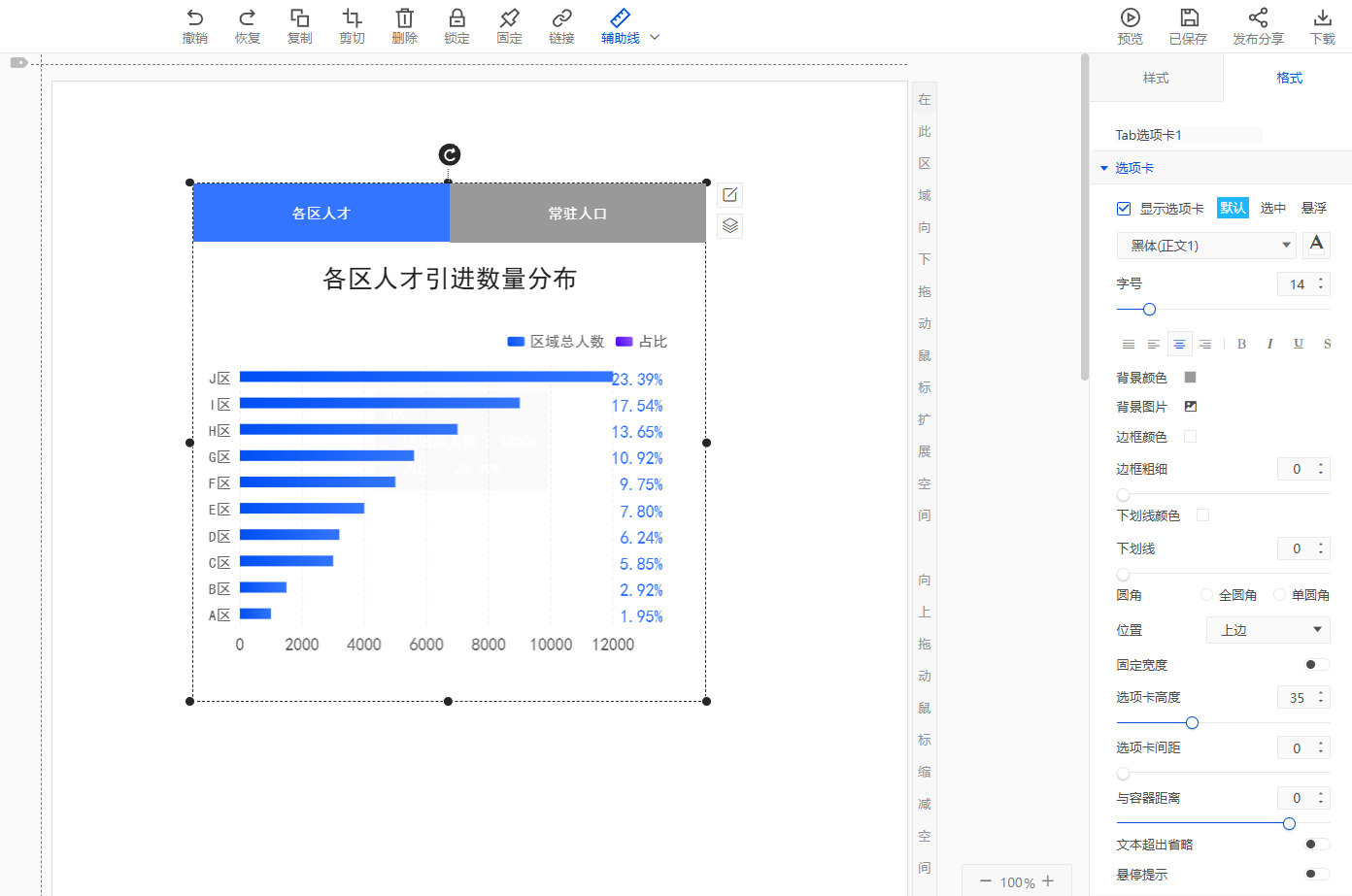 3. 选项卡插入后,可以进行选项卡、容器等格式属性设置。