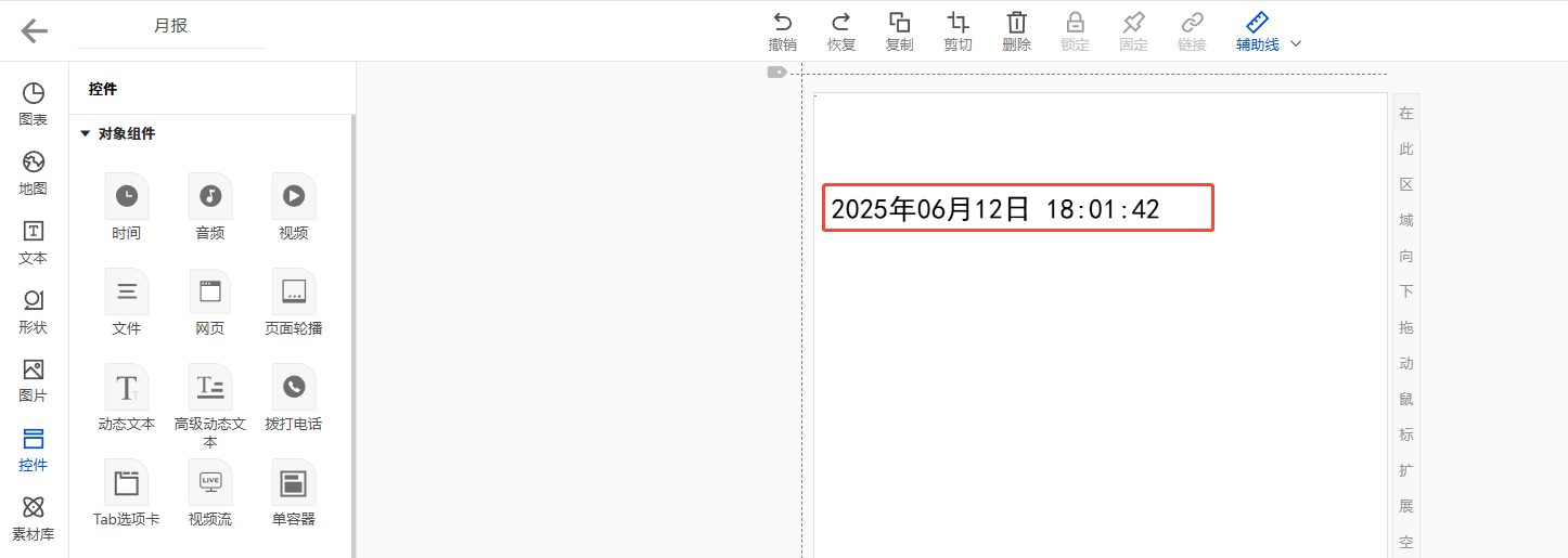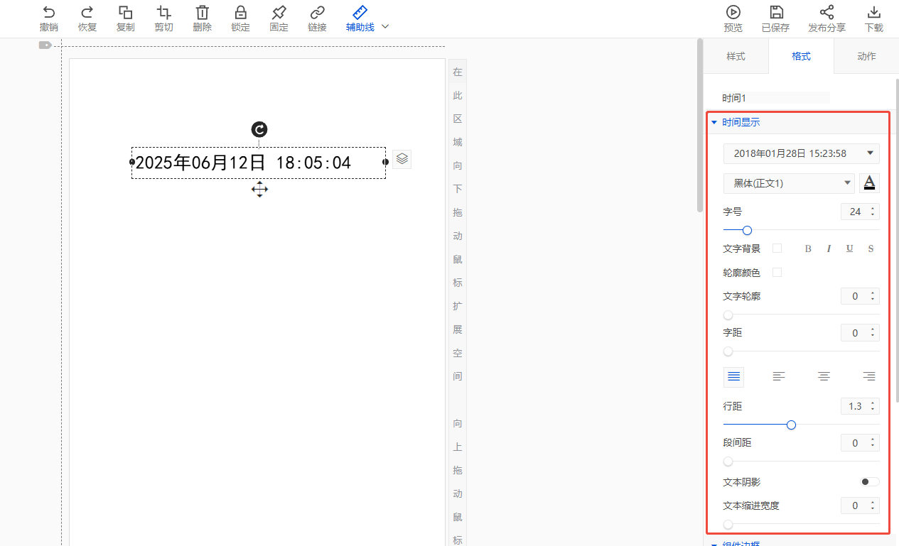 时间组件插入后,可以进行时间显示,组件边框等格式设置。