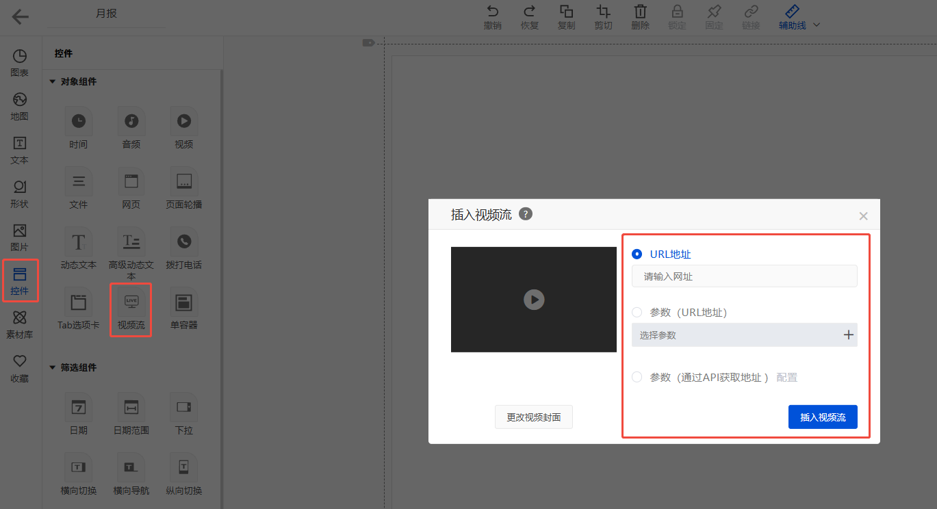 在制作应运营监控主题时,可以在报告中添加视频流组件,方便在查看报告时实现实时监控的目的。