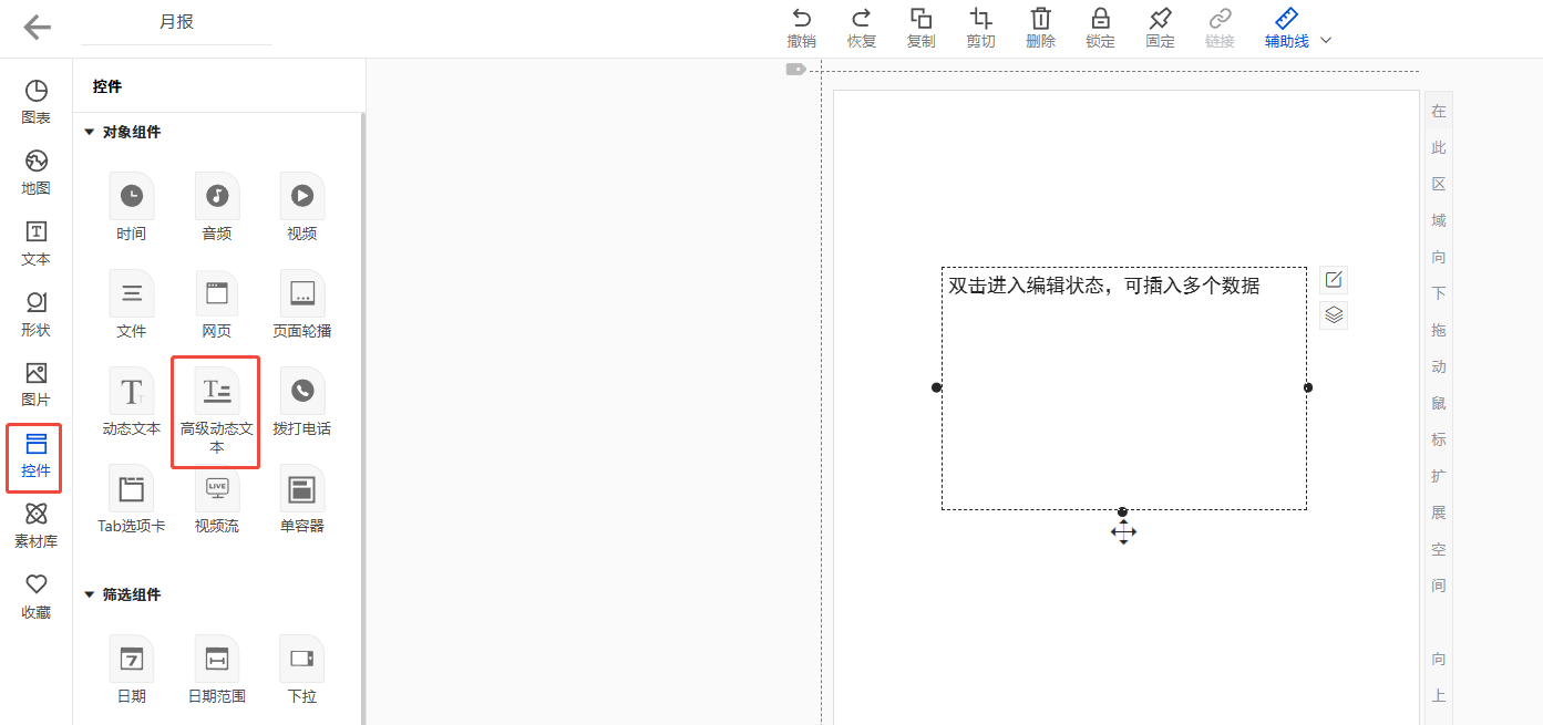 1. 双击高级动态文本,单击组件右上角插入数据图标。