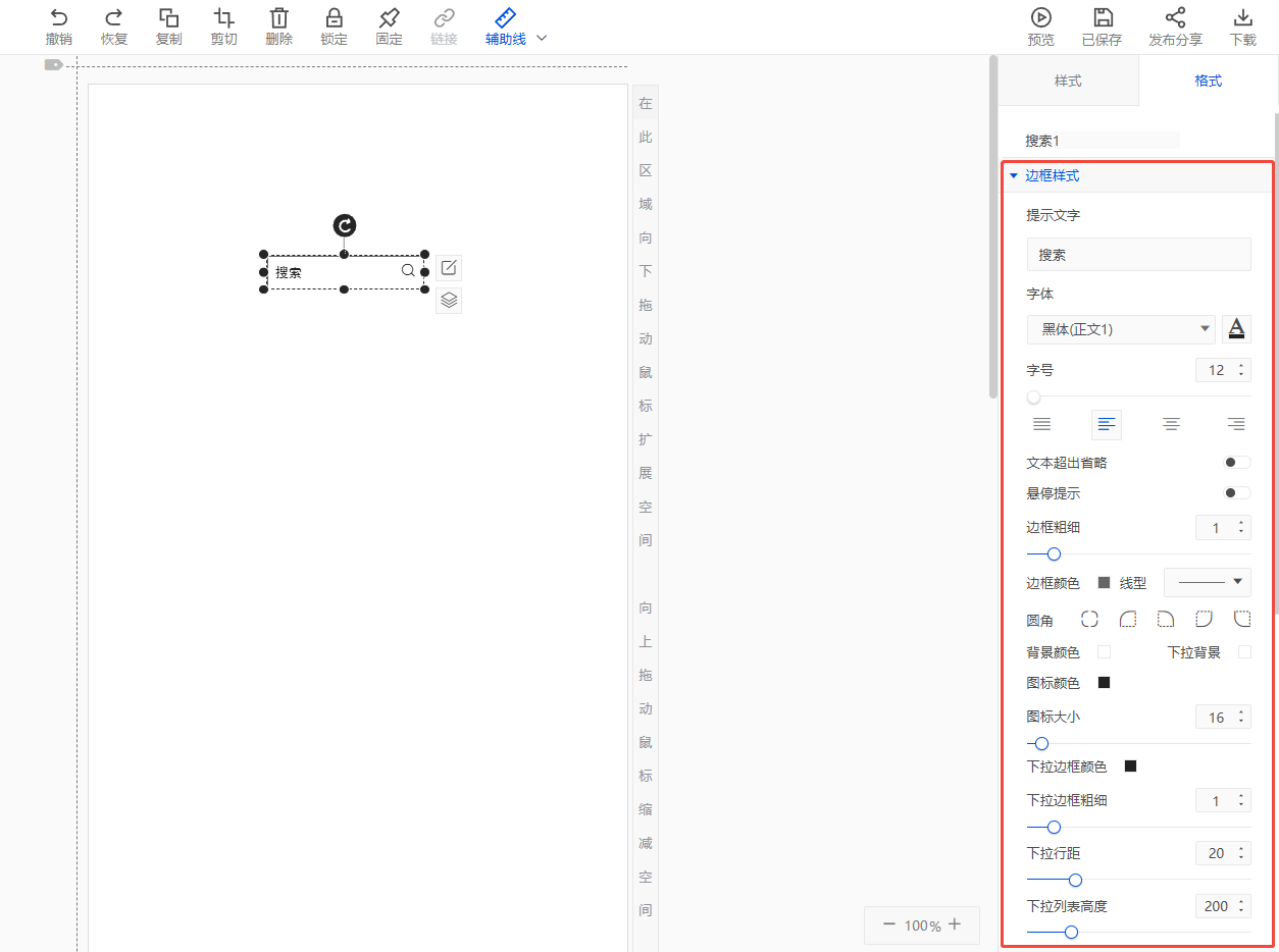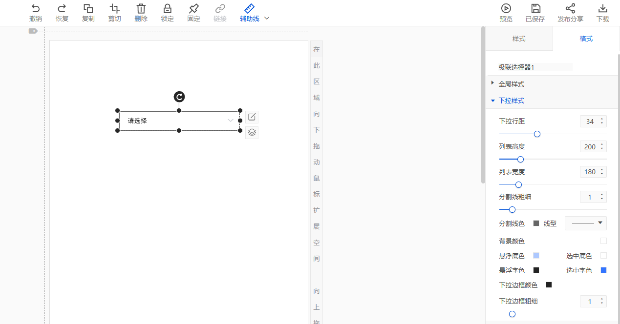 下拉样式:下拉行距,列表高度,列表宽度,分割线粗细,分割线色,线型,背景颜色,悬浮底色,选中底色,悬浮字色,选中字色,下拉边框颜色,下拉边框粗细。