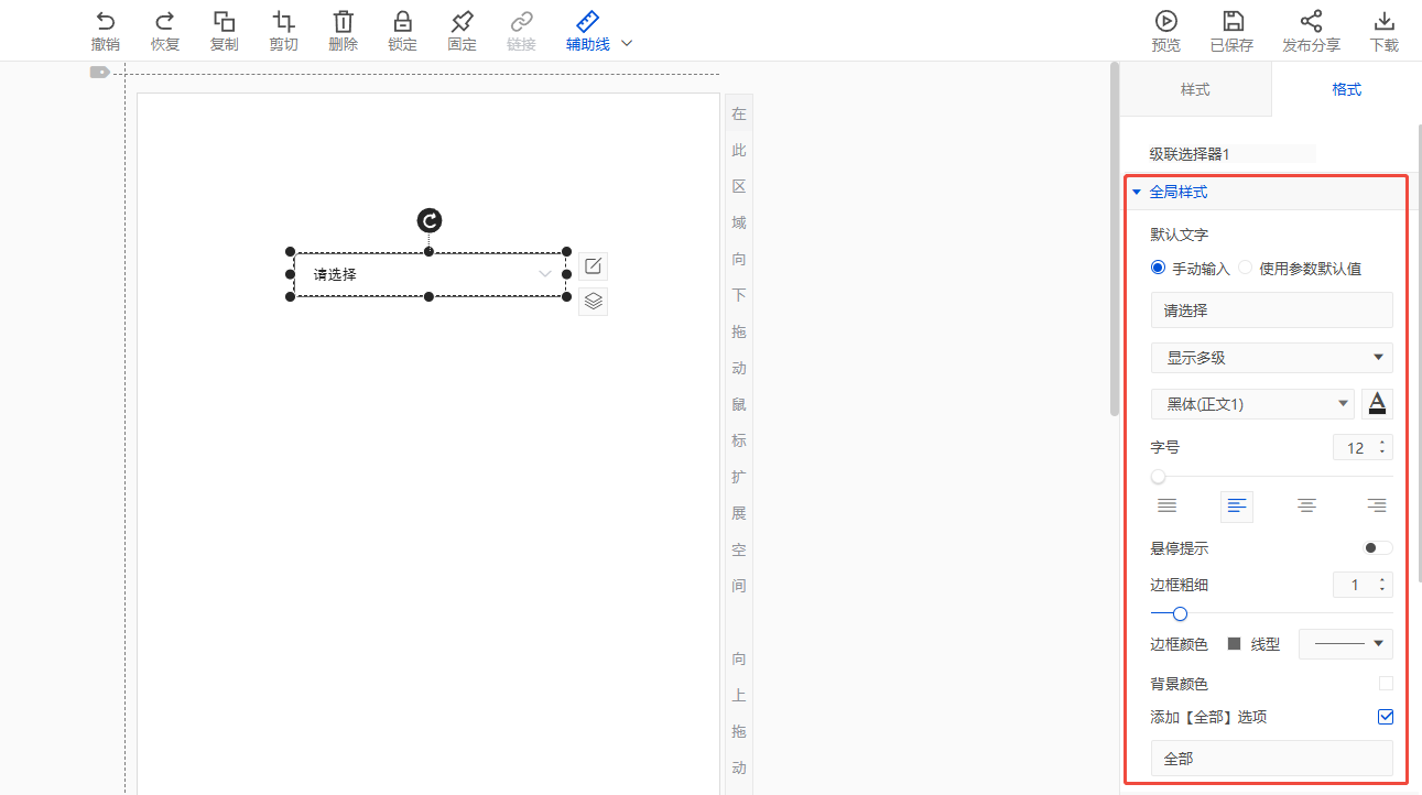 全局样式:默认选中模式,字体,文字颜色,字号,对齐方式,悬停提示,边框粗细,边框颜色,添加【全部】选项。
