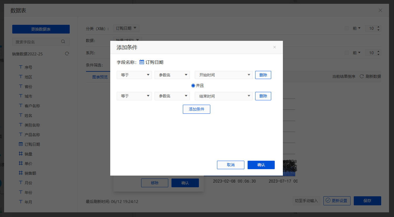 3. 图表数据来自数据表 > 图表数据连接时要设置条件筛选大于等于自定义的起始日期参数,小于等于结束日期参数。