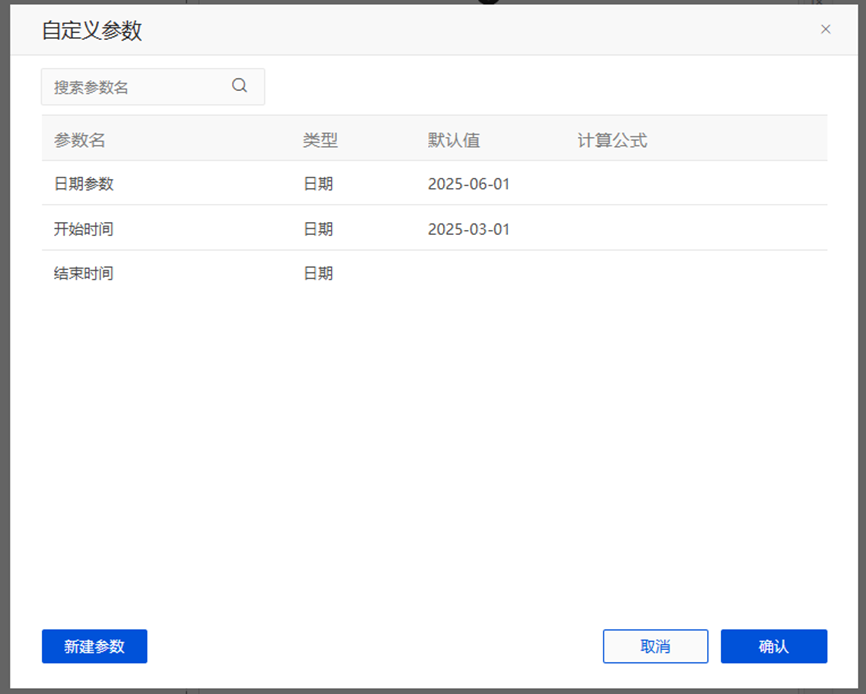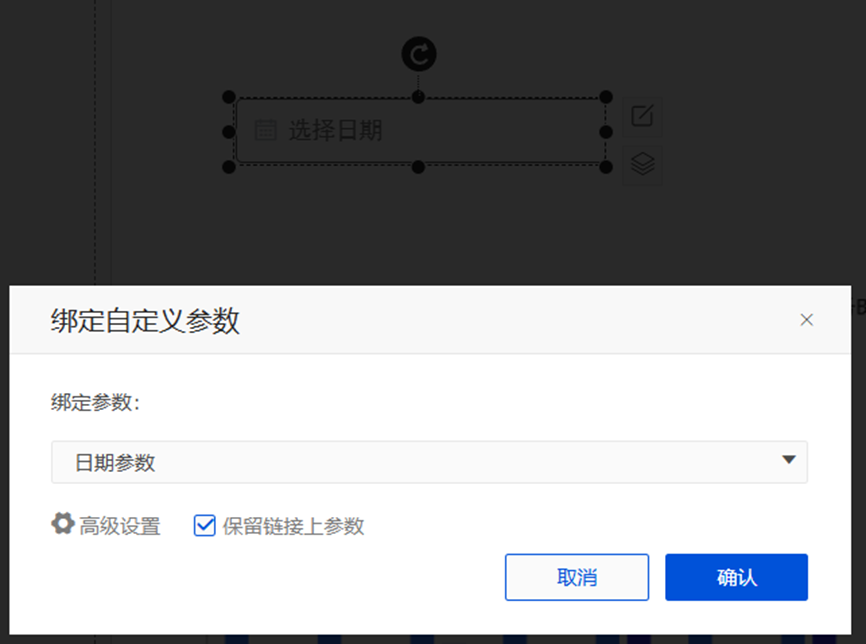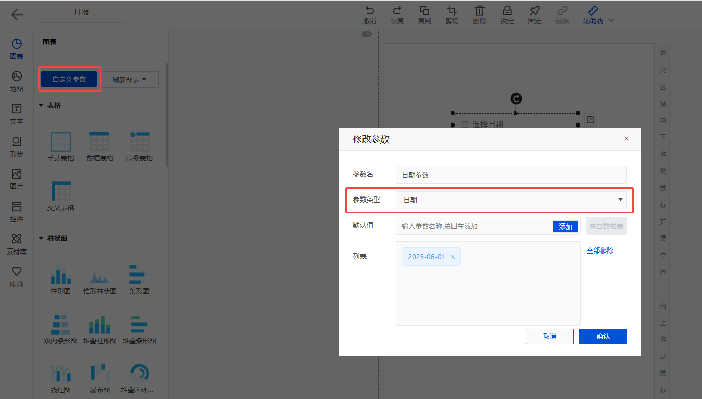 创建日期参数:图表 > 自定义参数 > 新增参数 > 参数名称命名 > 参数类型设置为日期 > 添加一个参数默认值(默认值格式:“年-月-日”)> 确认。