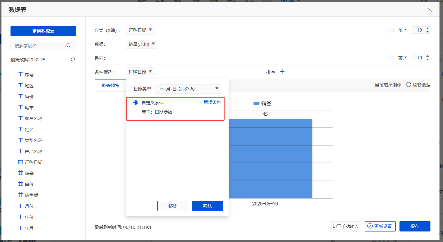 图表数据来自数据表 > 图表数据连接时,要设置条件筛选等于自定义的日期参数。