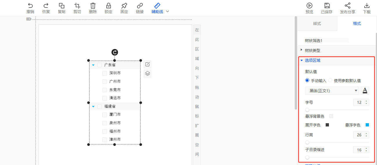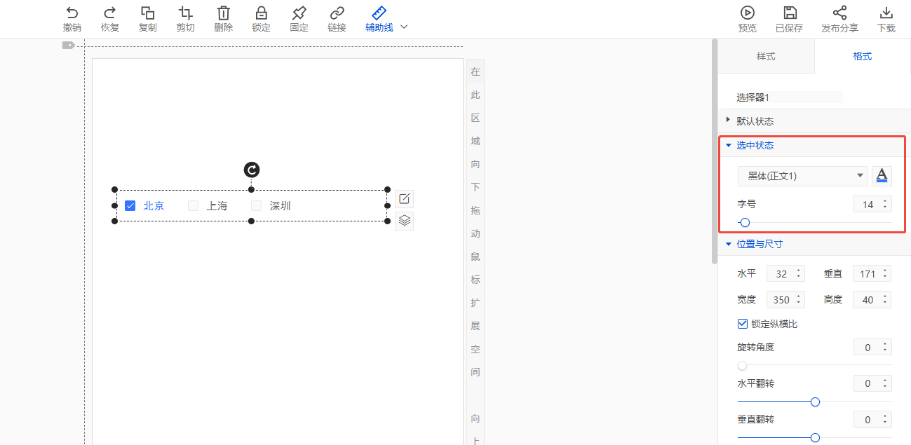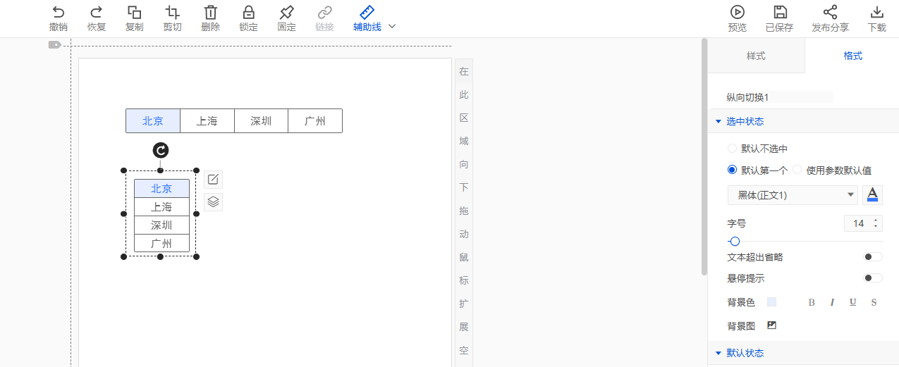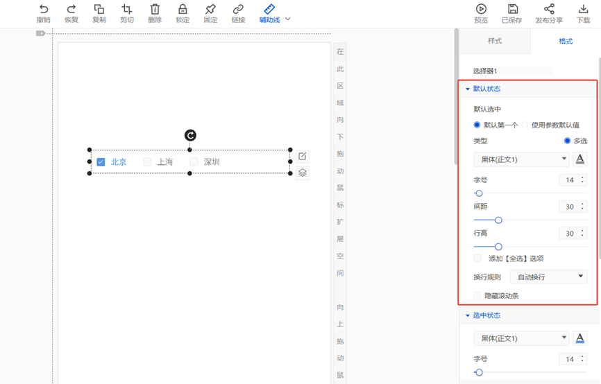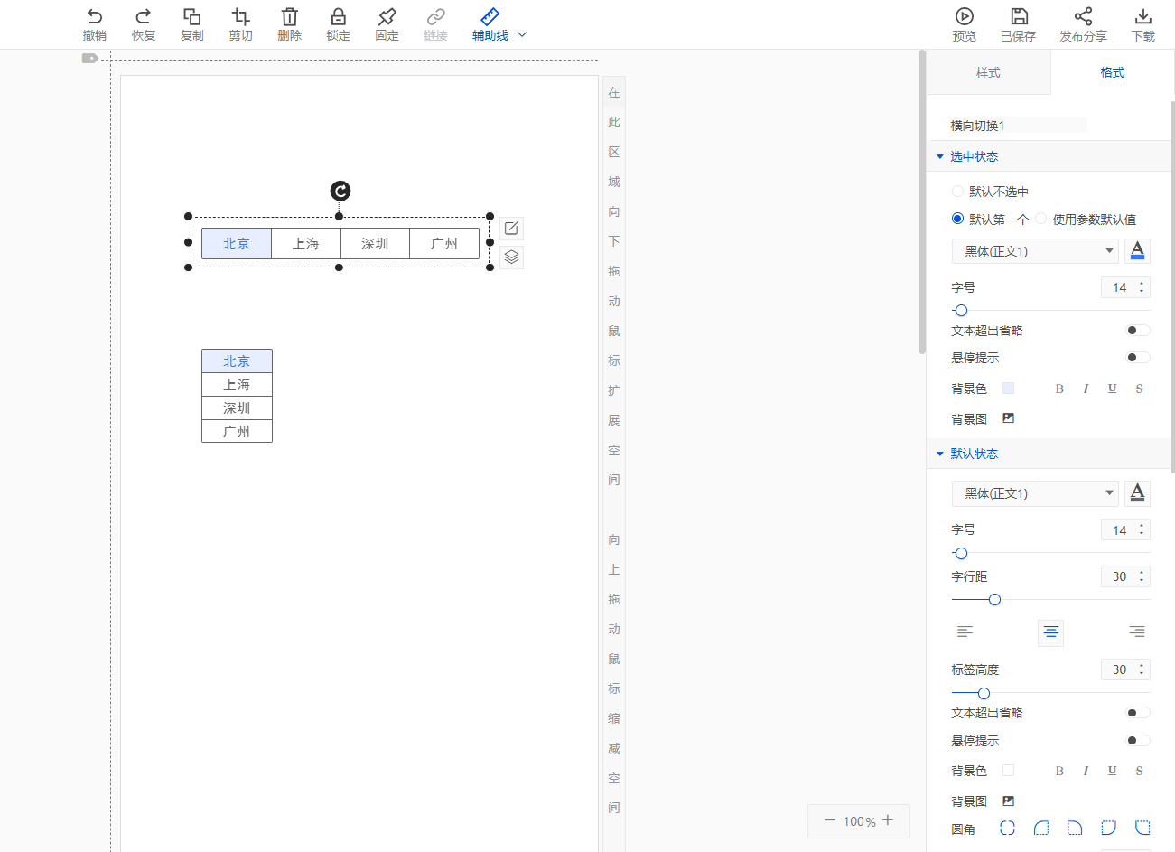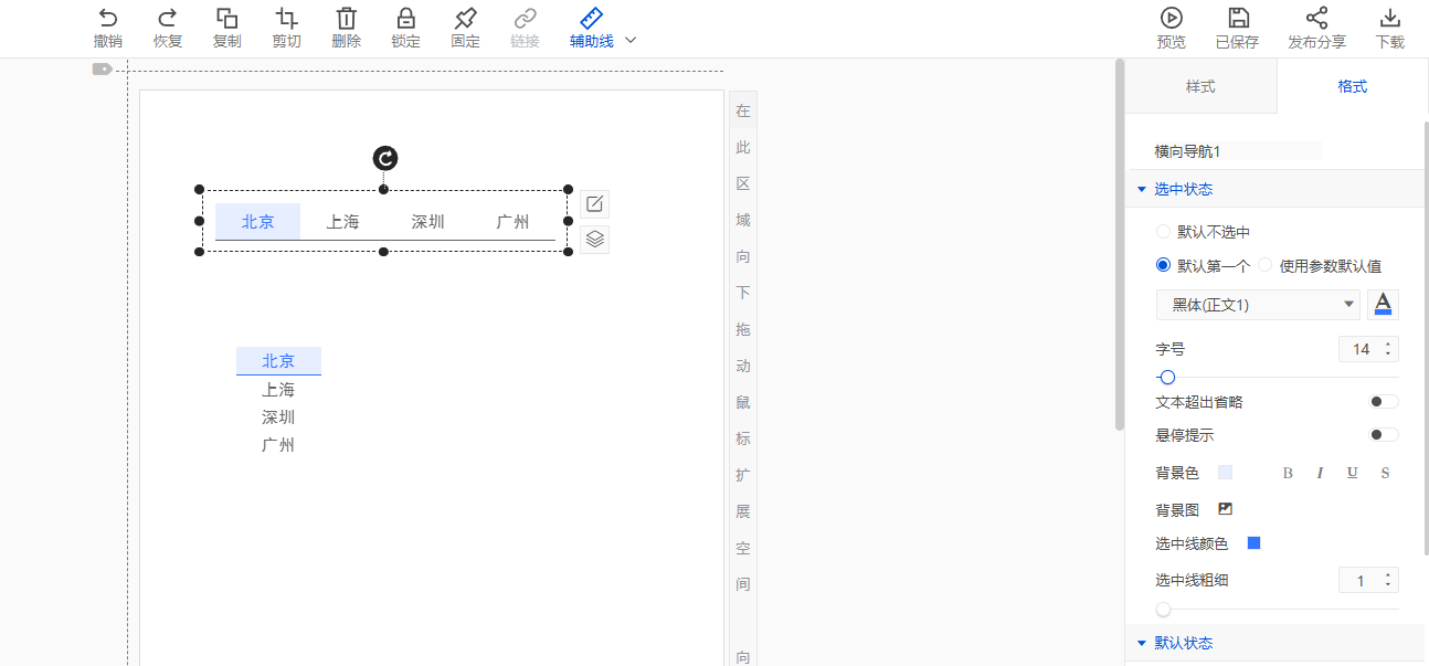 选中状态:默认选中模式,字体,文字颜色,字号,文本超出省略,悬停提示,背景色,背景图,选中线颜色,选中线粗细。