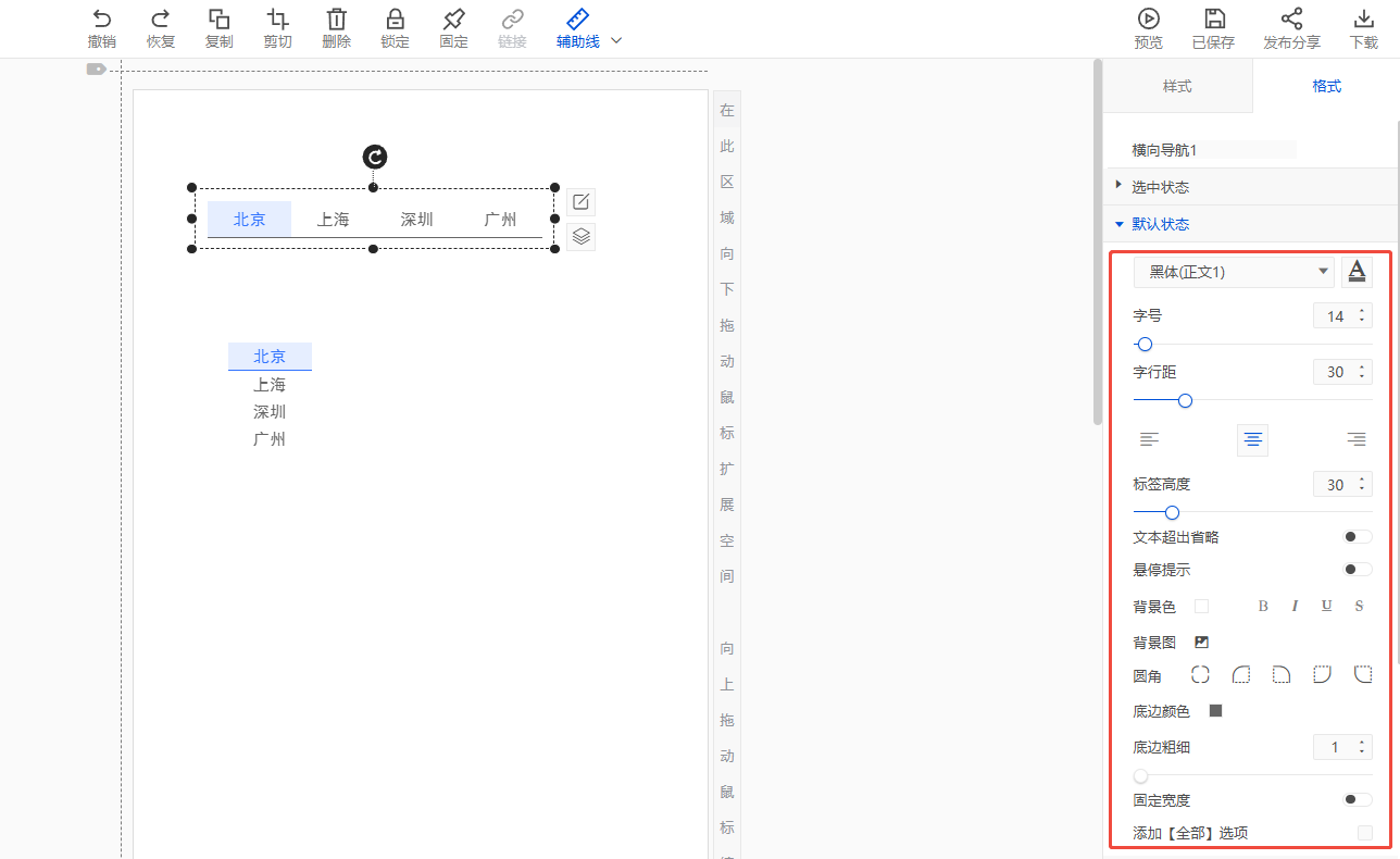 默认状态:字体,文字颜色,字号,字行距,对齐方式,标签高度,文本超出省略,悬停提示,背景色,背景图,圆角,底边颜色,底边粗细,固定高度/宽度,添加【全部】选项。