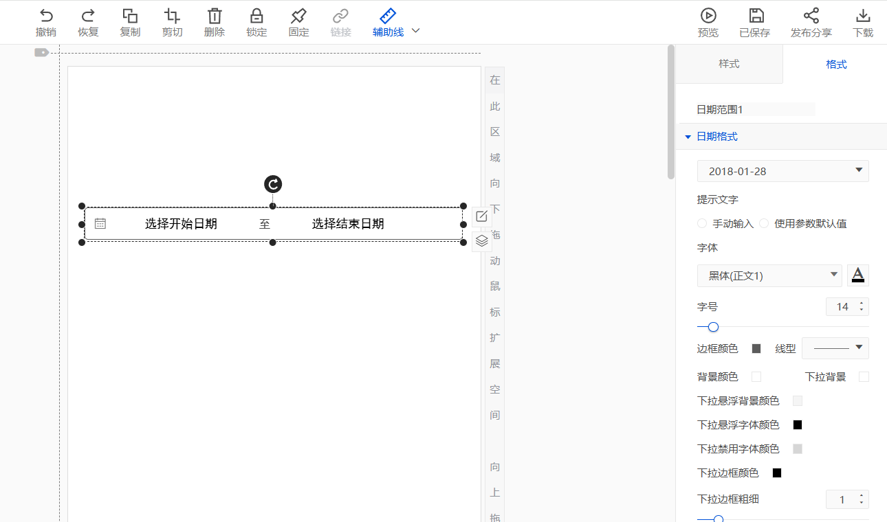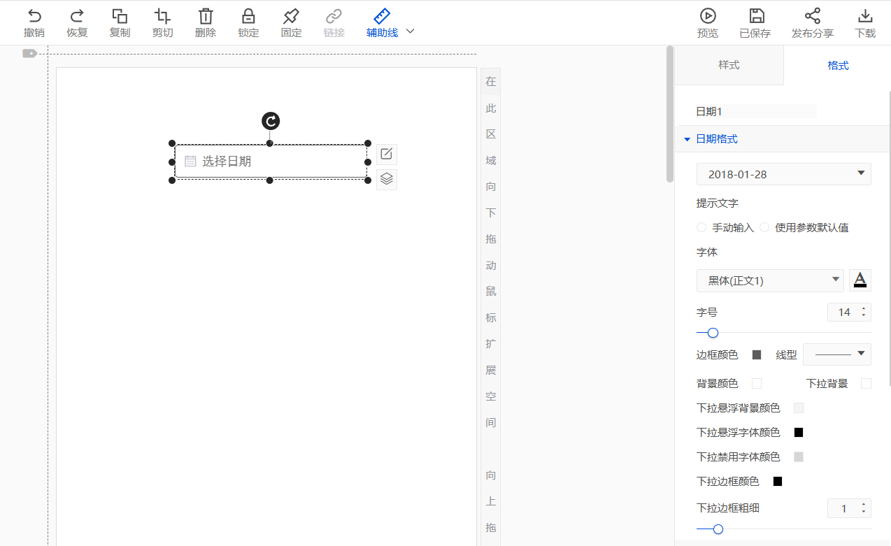 日期格式,提示文字,字体,文字颜色,字号,边框颜色,背景颜色,下拉背景,下拉悬浮背景颜色,下拉悬浮字体颜色,下拉警用字体颜色,下拉边框颜色,下拉边框粗细。