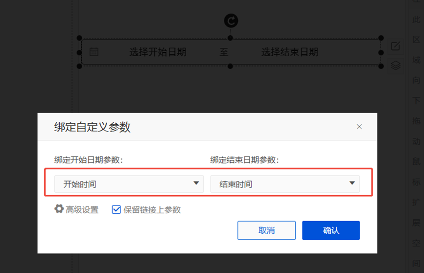 2. 日期范围组件应用:日期范围组件绑定参数。