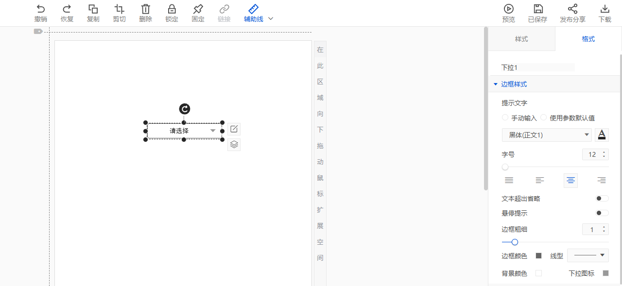 设置提示文字,字号,对齐方式,文本超过省略,悬停提示,边框粗细,边框颜色,背景颜色,下拉图标颜色。