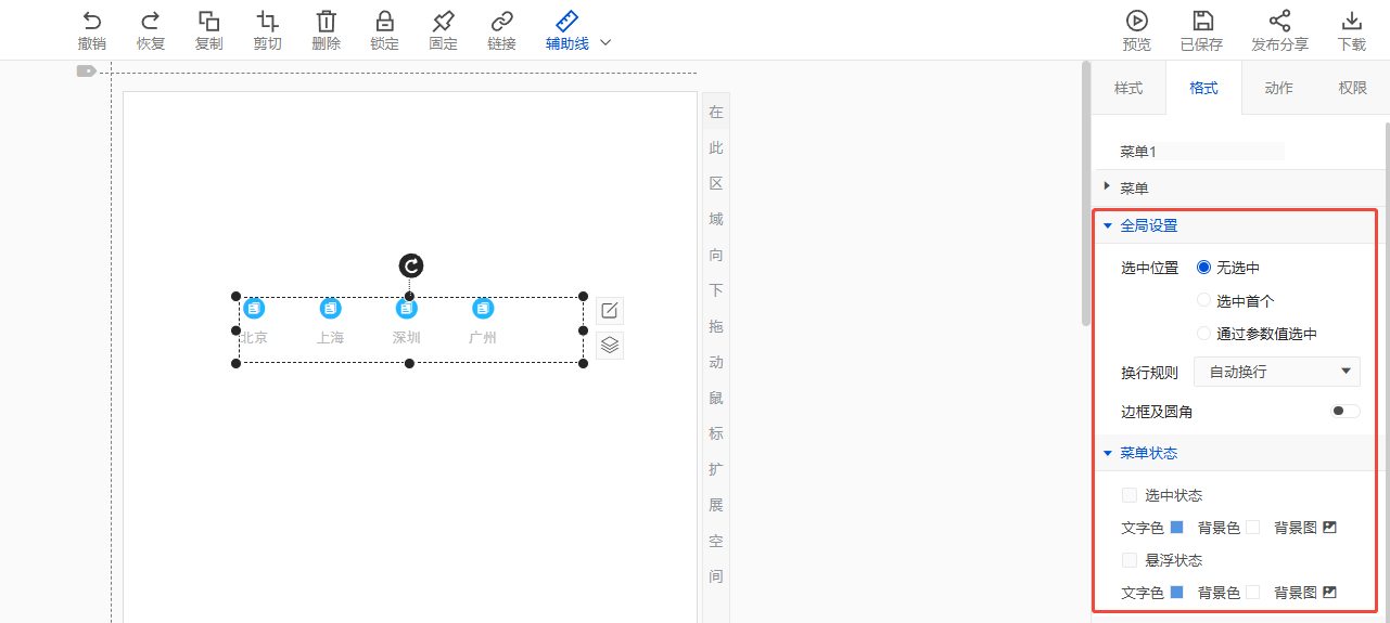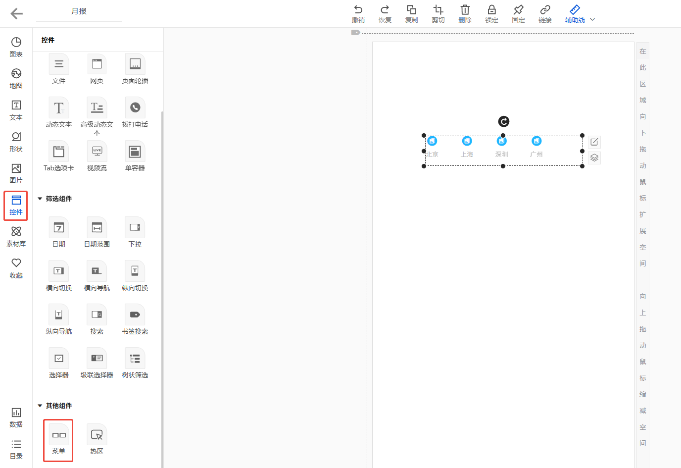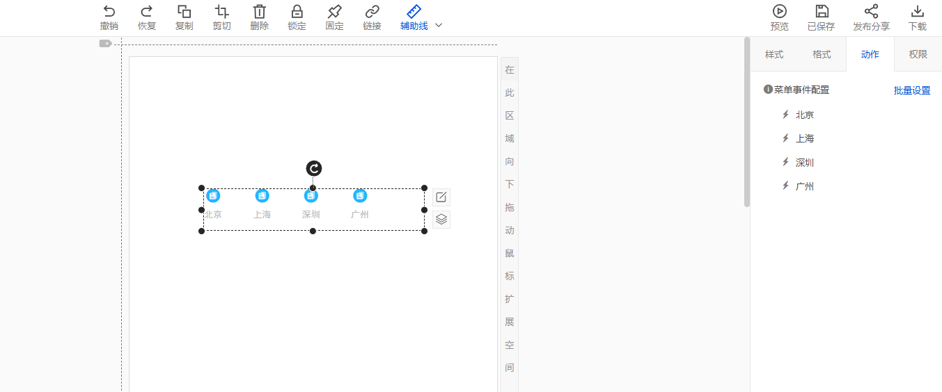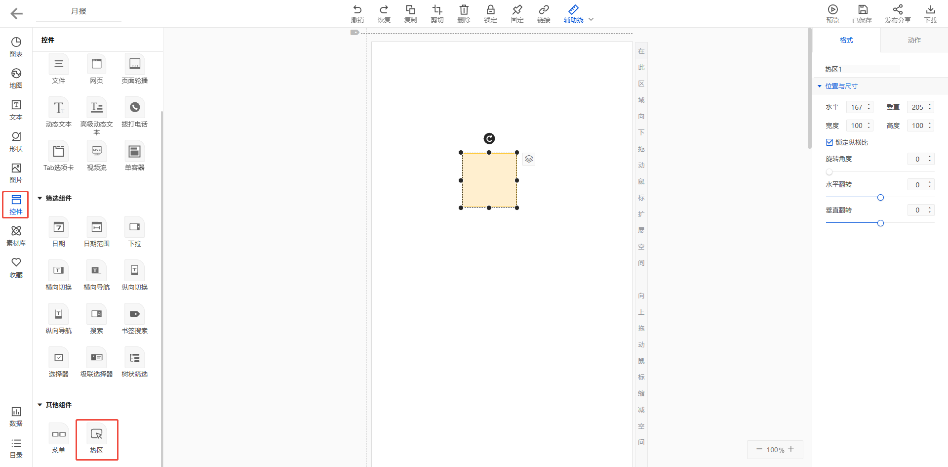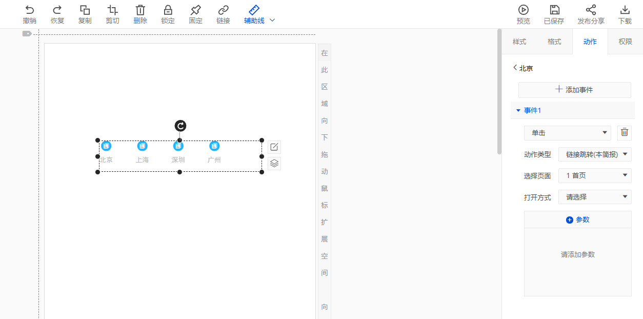 在做简报的时候,可能在一张图中增加多个可点击区域进行跳转或交互,可以使用热区组件添加链接及动作(热区组件在编辑页可见,在播放页不可见)。