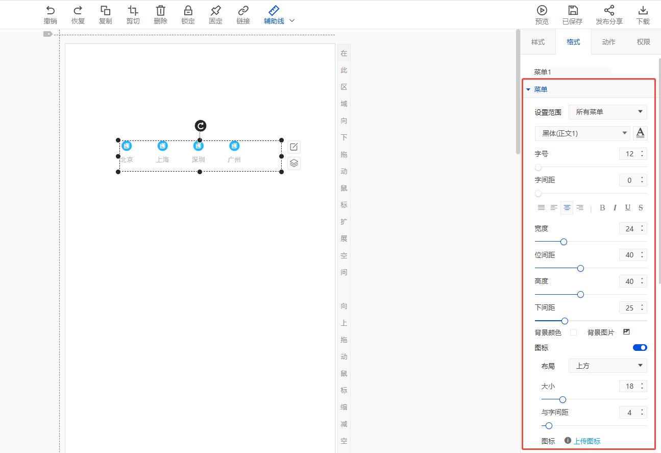 菜单:设置范围,字体,文字颜色,字号,字间距,对齐方式,加粗,倾斜,下划线,中划线,宽度,位间距,高度,下间距,背景颜色,背景图片,图标设置,图标上传。