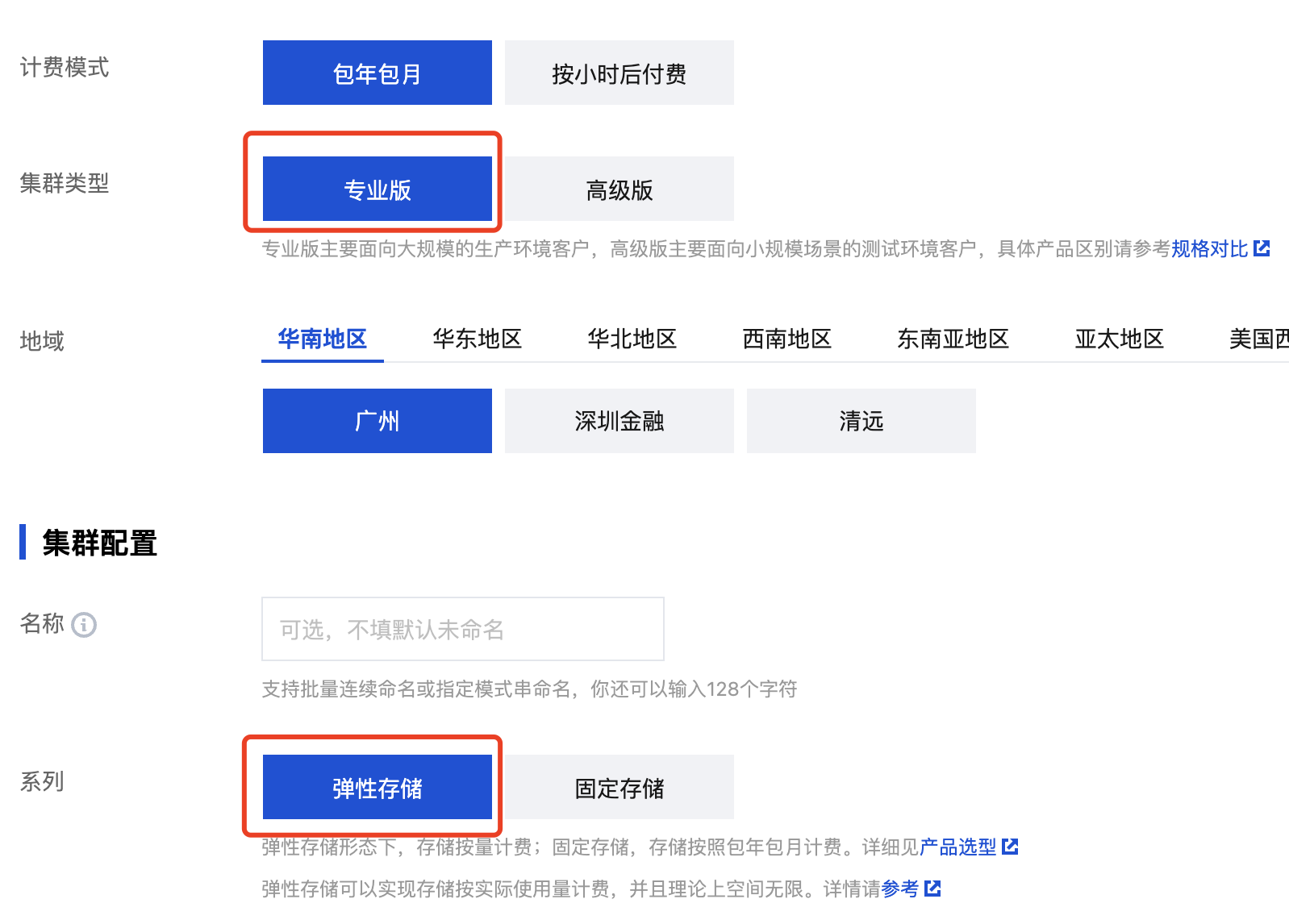 3. 在实例购买页面,集群类型选择专业版,系列选择弹性存储,其他选项根据您的业务需求进行选择。