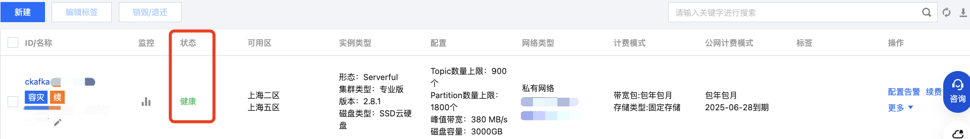 CKafka 对每个实例均设置有巡检程序,巡检程序会检查该实例的连接数、磁盘使用百分比、生产峰值带宽、消费峰值带宽,当这些指标超过一定的阈值后会产生不同的健康状态。详细状态说明请参考监控指标及异常说明。