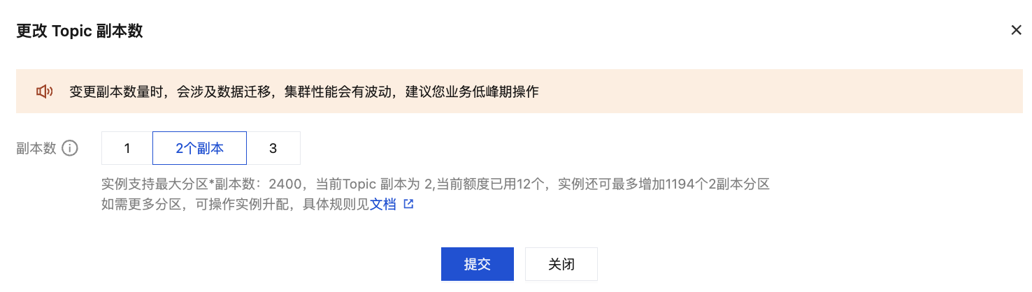 Topic 副本数量支持1、2、3个,为保障数据可靠性,默认开启2副本。设置为单副本会导致可用性无法保证,请谨慎操作。