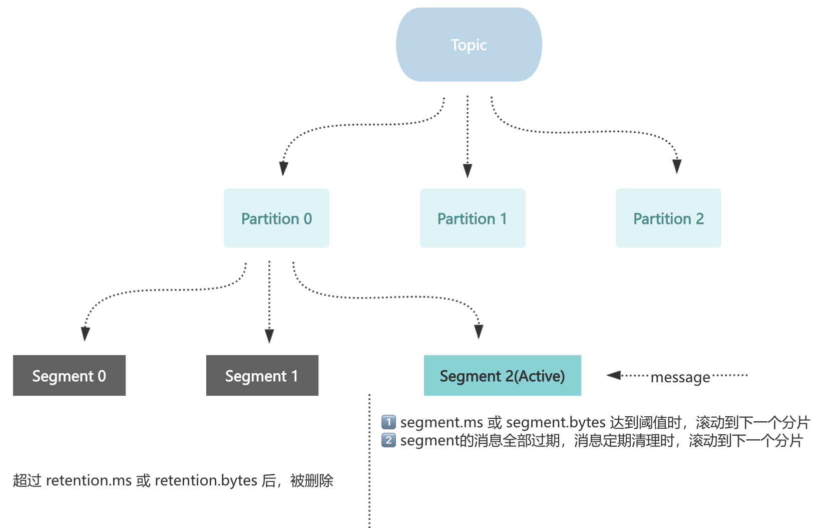 基于时间的滚动(segment.ms):当当前活动分片的存在时间超过配置的 segment.ms 时,Kafka 会关闭当前分片并创建一个新的分片。