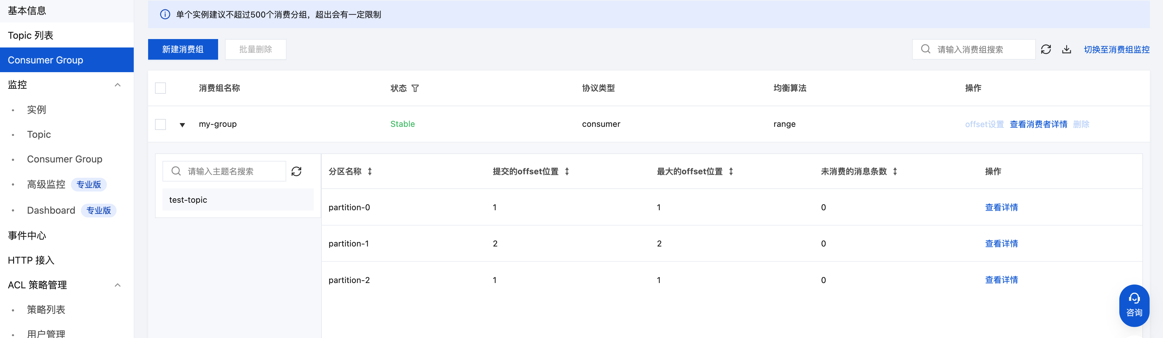 4. 在 CKafka 控制台 的 Consumer Group 页面,选择对应的消费组名称,在主题名称输入 Topic 名称,单击查询详情,查看消费详情。