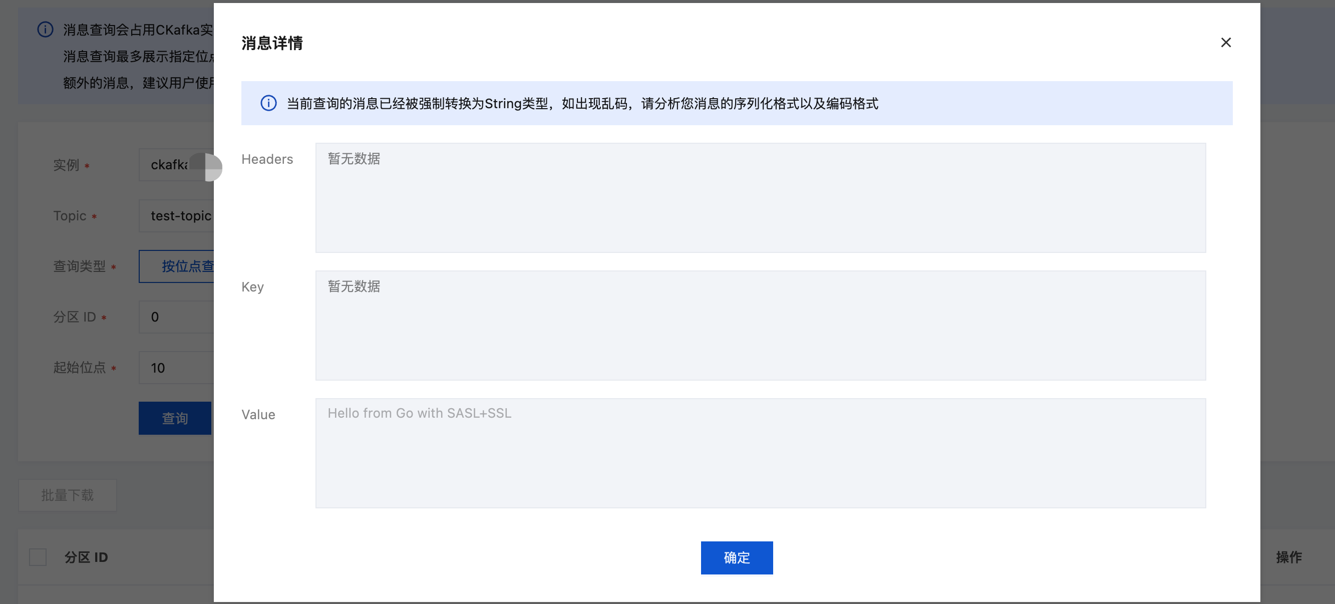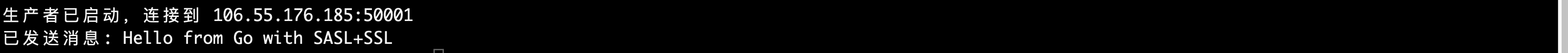 // main.gopackage mainimport ("fmt""github.com/confluentinc/confluent-kafka-go/kafka")func main() {// ======== 请替换为你的实际配置 ========brokers := "$bootstrapServers" // Kafka 地址topic := "$topic" // topic名字saslUsername := "$sasl.username" // SASL 用户名saslPassword := "$sasl.password" // SASL 密码caFile := "./CARoot.pem" // CA 证书路径,控制台下载retries := 5 // 重试次数message := "Hello from Go with SASL+SSL"// =====================================config := &kafka.ConfigMap{"bootstrap.servers": brokers,"security.protocol": "sasl_ssl", // 启用 SASL over SSL"ssl.ca.location": caFile, // 指定 CA 证书"sasl.mechanisms": "PLAIN", // 认证机制"sasl.username": saslUsername,"sasl.password": saslPassword,"acks": "1", // 只等待 leader 确认"message.send.max.retries": retries,"retry.backoff.ms": 1000,"socket.timeout.ms": 30000,"session.timeout.ms": 30000,"enable.idempotence": false, // 关闭幂等,避免强制 acks=all"max.in.flight.requests.per.connection": 5,}// 创建生产者p, err := kafka.NewProducer(config)if err != nil {fmt.Printf("创建生产者失败: %v\\n", err)return}defer p.Close()fmt.Printf("生产者已启动,连接到 %s\\n", brokers)// 发送消息err = p.Produce(&kafka.Message{TopicPartition: kafka.TopicPartition{Topic: &topic,Partition: kafka.PartitionAny,},Value: []byte(message),}, nil)if err != nil {fmt.Printf("消息发送失败: %v\\n", err)} else {fmt.Printf("已发送消息: %s\\n", message)}p.Flush(3*1000)}