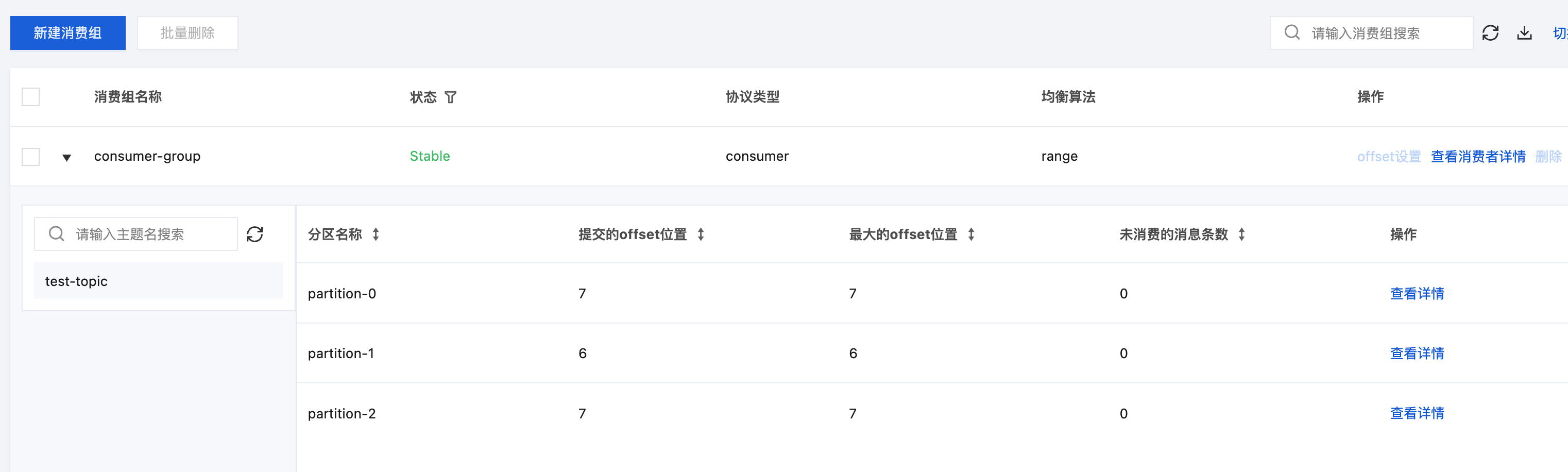 4. 在 CKafka 控制台 Consumer Group 页面,查看消费详情。