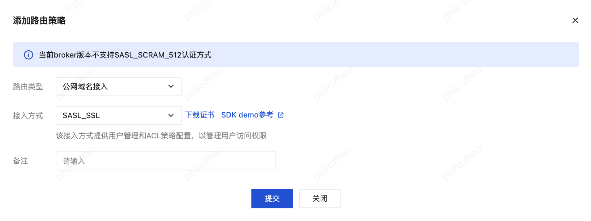 路由类型:公网域名接入, 接入方式:SASL_SSL。