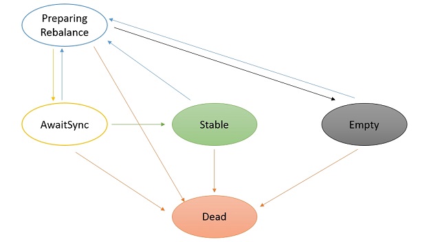 消费者组列表页中 Consumer Group 的状态主要有 Dead、Empty、PreparingRebalance、AwaitingSync、Stable 几种,其中最常见的是 Empty、Stable 和 Dead 三种状态。Consumer Group 中的状态机转换如下图所示: