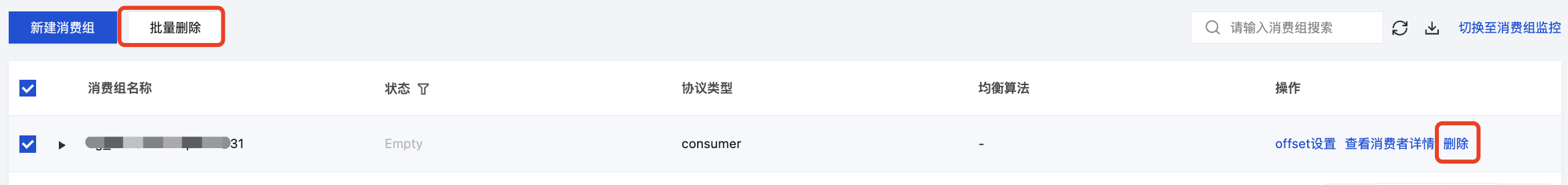 批量删除:勾选所有需要删除的消费组,点击左上角的批量删除。