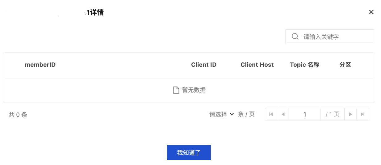 4. 单击消费组操作栏的查看消费者详情,可以查看该消费组中的消费者信息,包含具体的消费者和订阅 Topic 的对应关系。