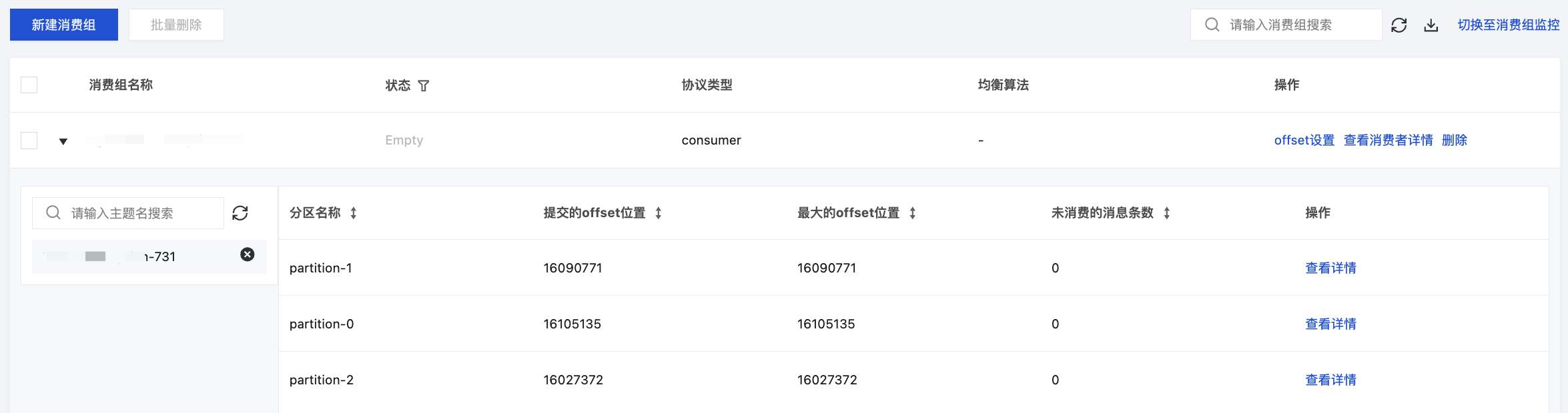 操作 | 单击分区操作列的查看详情可以看到分区级别的 offset 消费情况。 |