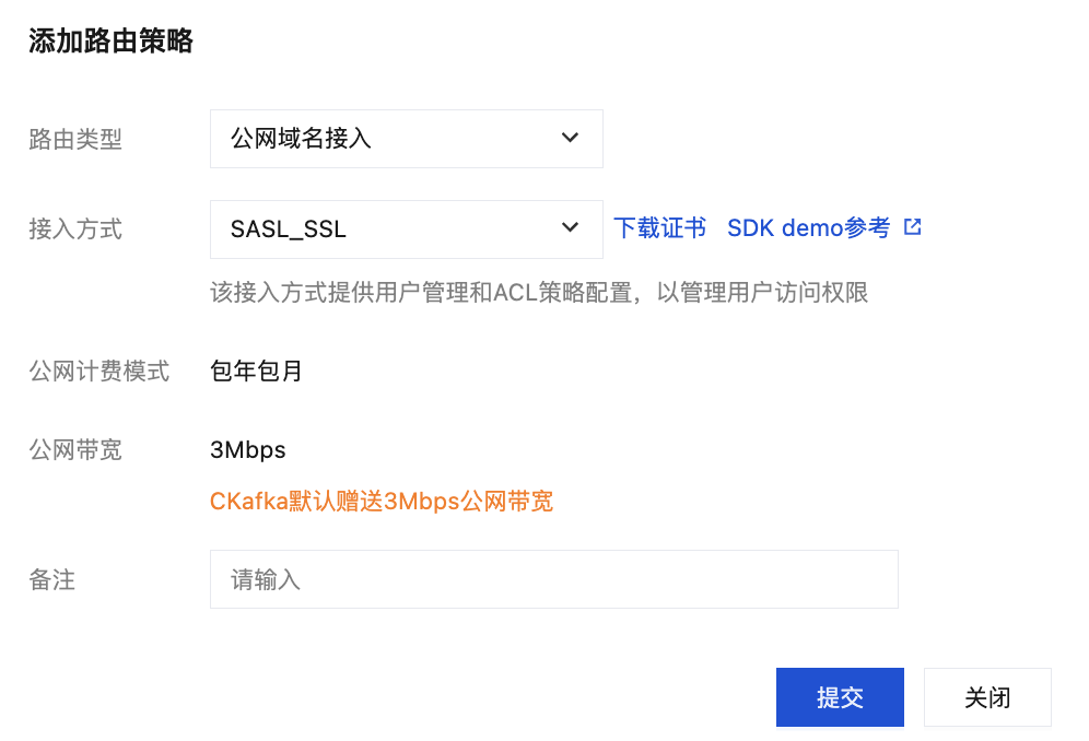 路由类型:公网域名接入,接入方式:SASL_SSL。