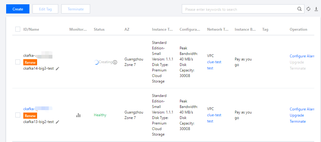Log in to the CKafka console and view the newly created instances. You can see that the batch purchased instances are named according to the rule you set: