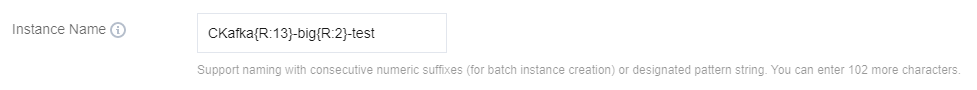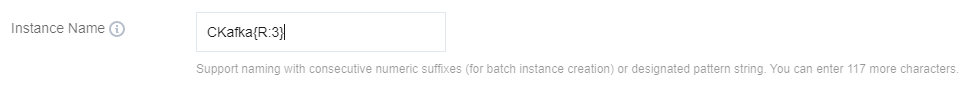 Specifying one pattern string: This is suitable if you need to create n instances and specify their names with incrementing serial numbers starting from x (such as ckafka3, ckafka4, ckafka5...). For more information, see Specifying one pattern string.