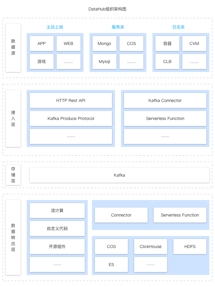 数据接入平台(DataHub)是腾讯云上的数据接入和处理平台,一站式提供对数据的接入、处理和分发功能。Datahub 可以持续不断地接收和采集(APP、Web、云产品日志等)数据,实时处理,低成本搭建数据流转链路,构建数据源和数据处理系统间的桥梁。