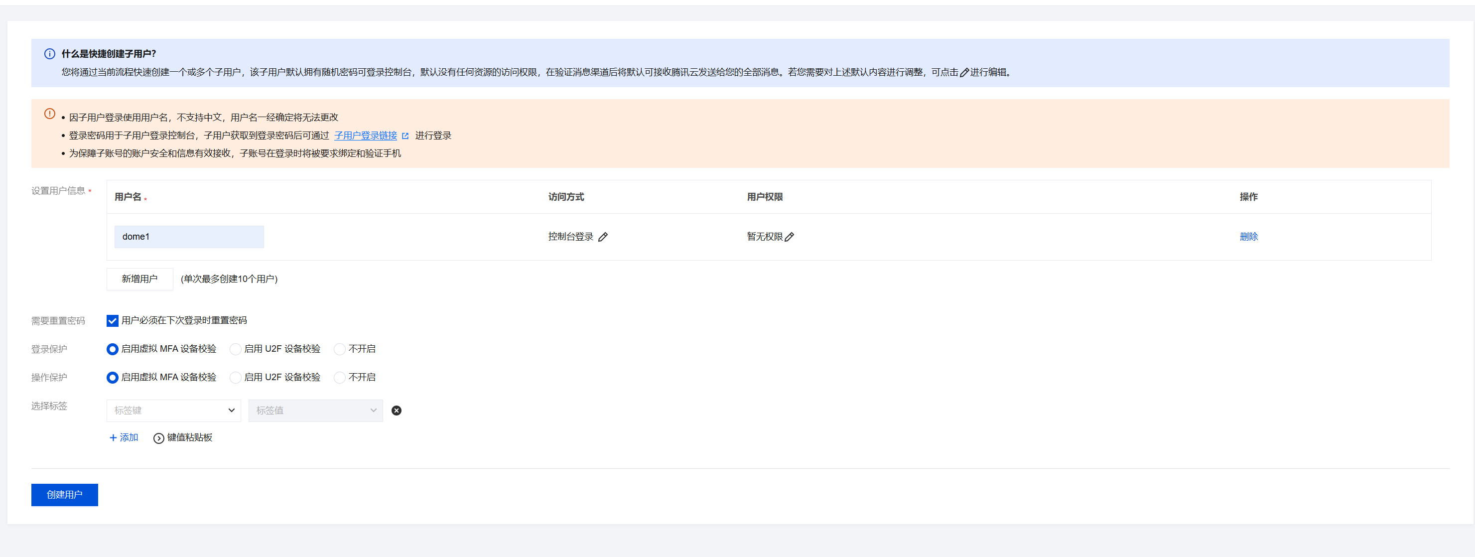 快速创建子用户时,默认拥有管理员权限(即绑定 AdministratorAccess 策略)。