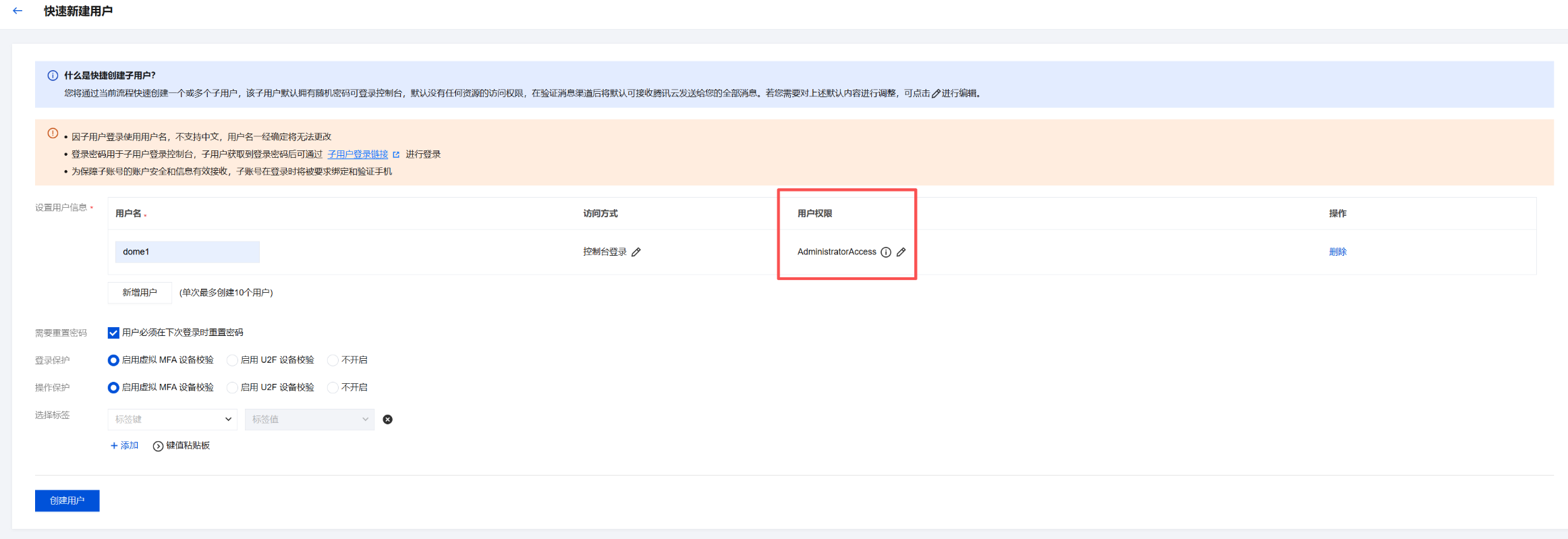 该任务指导您使用主账号在访问管理控制台,快速创建一个有管理员权限的子用户。该管理员账号可以管理您腾讯云账号内所有用户及其权限、财务相关的信息、以及云服务资产。