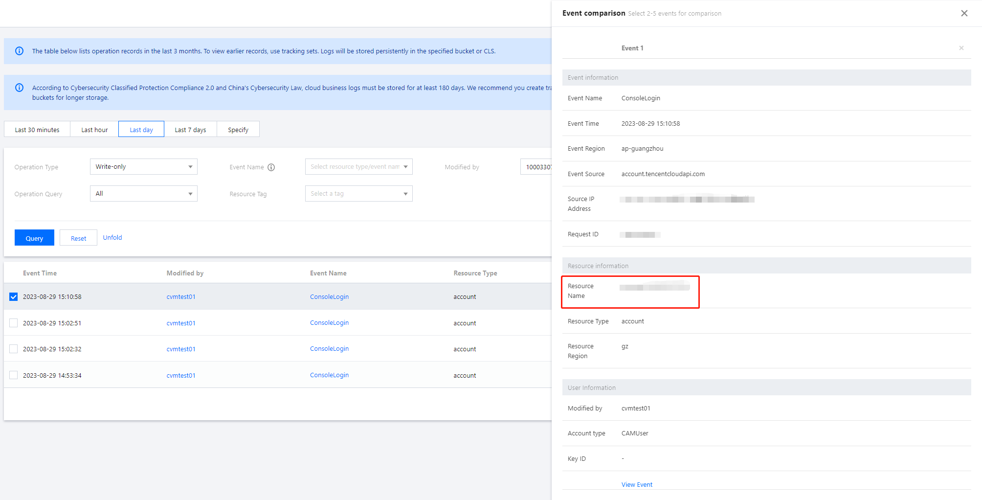 At this point, you can use CloudAudit to view and track the operation records of your employees. CloudAudit supports online viewing of Tencent Cloud console and cloud API operation records within the past 90 days.