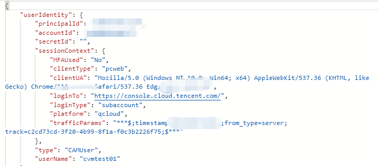 In the detailed log information, you can identify the actual operating account ID through the principalId.