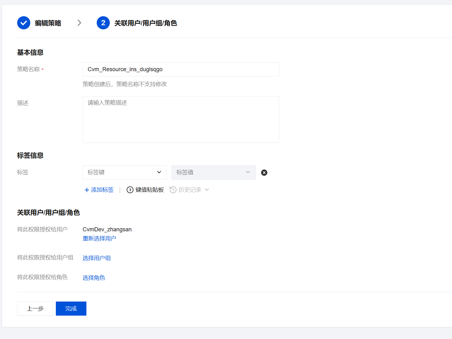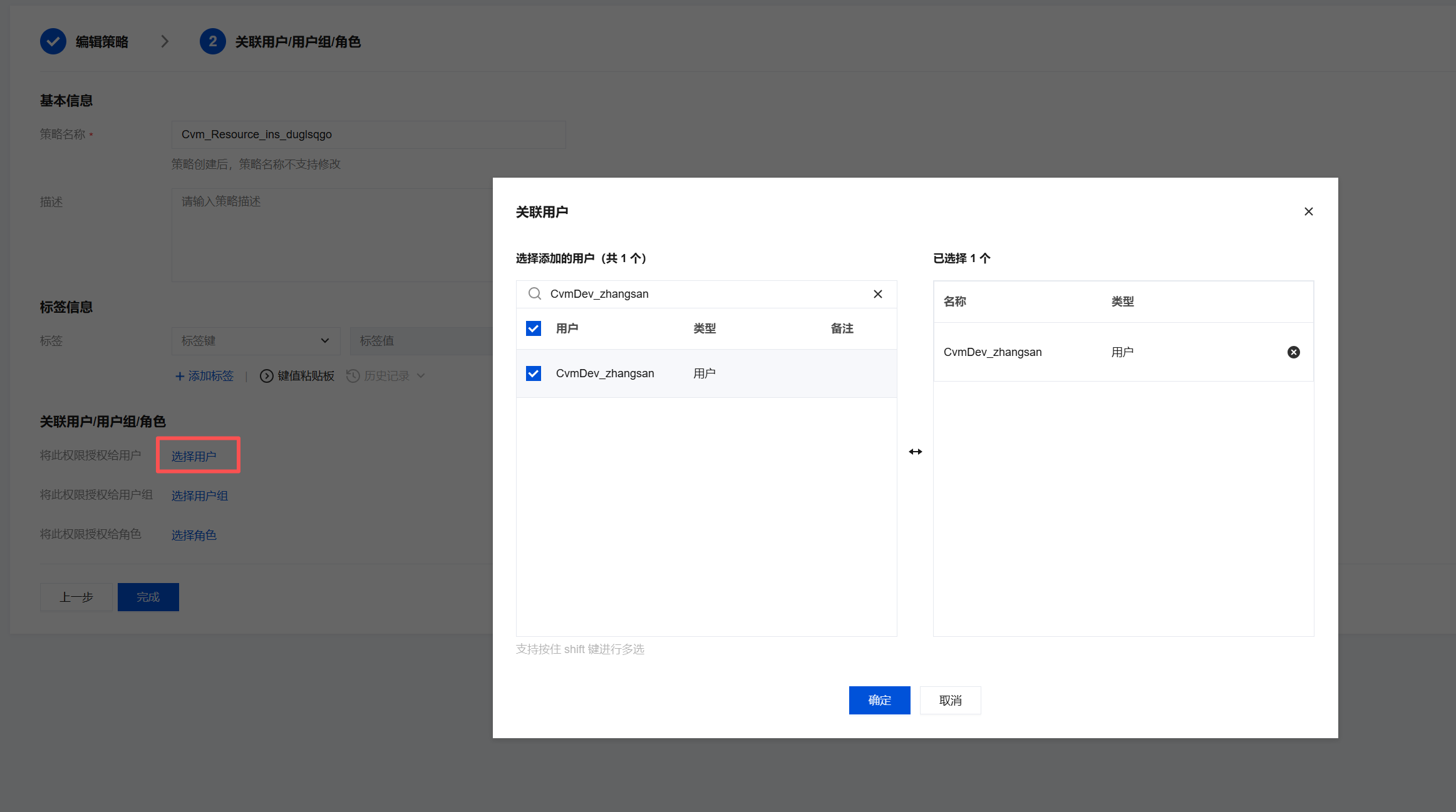 4. 填写策略名称并选择授权用户(查询搜索用户:CvmDev_zhangsan)。