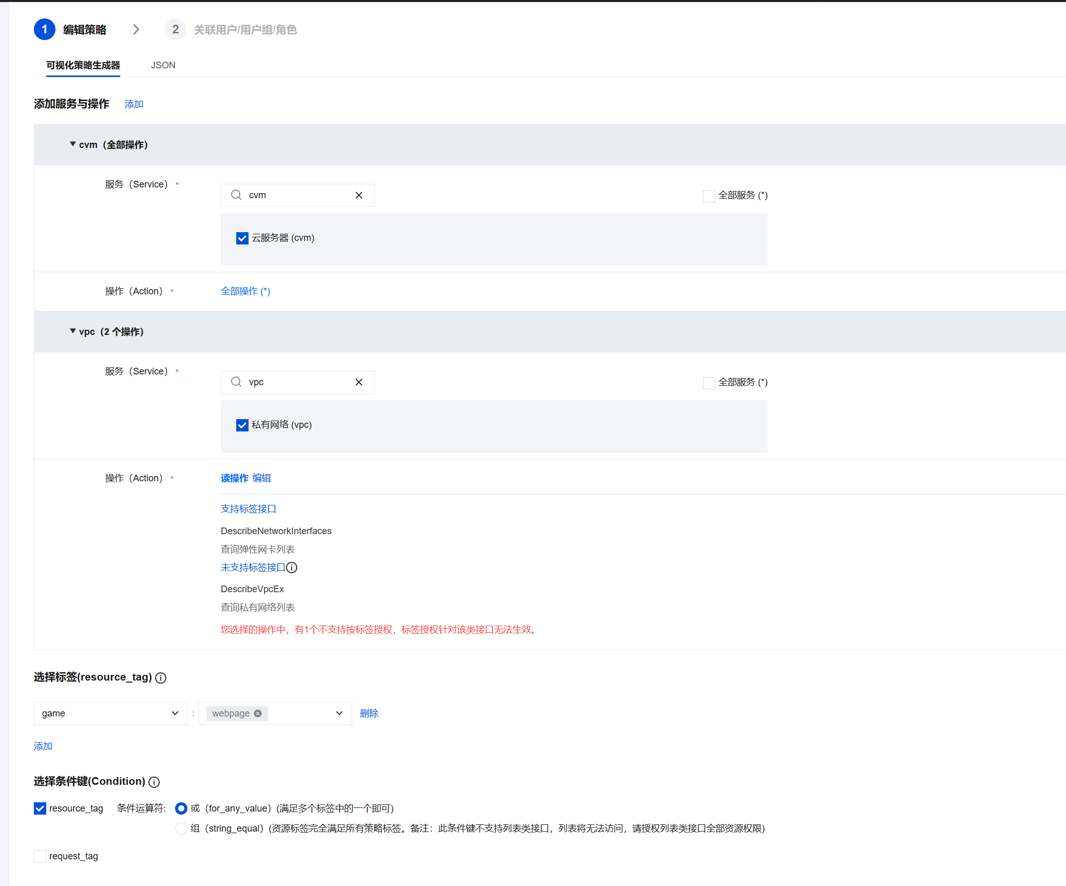 {"version": "2.0","statement": [{"effect": "allow","condition": {"for_any_value:string_equal": {"qcs:resource_tag": ["game&webpage"]}},"action": ["cvm:*","vpc:DescribeNetworkInterfaces"],"resource": "*"},{"effect": "allow","resource": "*","action": ["cvm:AllocateAddresses","cvm:AssistRecommend","cvm:AssistRecommendConfig","cvm:AssociateNetworkInterfaceSecurityGroups","cvm:AssociateSecurityGroups","cvm:CancelCandidateOrder","cvm:CheckOpenClawRole","cvm:CloneSecurityGroup","cvm:CloneSecurityGroups","cvm:ColdMigrateInstance","cvm:ConfigureChcAssistVpc","cvm:ConfigureChcDeployVpc","cvm:CopySnapshotCrossRegions","cvm:CreateAutoSnapshotPolicy","cvm:CreateCandidateOrder","cvm:CreateCbsStorages","cvm:CreateDisks","cvm:CreateOpenClawAdmin","cvm:CreatePresetRules","cvm:CreateSecurityGroup","cvm:CreateSecurityGroupPolicy","cvm:CreateSecurityGroupWithPolicies","cvm:CreateSendOpenClawEmail","cvm:DeleteDiskSecurityConfigurations","cvm:DeleteInstancesActionTimer","cvm:DeleteKeyPairs","cvm:DeleteMigrateTask","cvm:DeletePresetRules","cvm:DeleteSecurityGroup","cvm:DeleteSecurityGroupPolicies","cvm:DeleteSecurityGroupPolicy","cvm:DescribeAccountAttributes","cvm:DescribeAccountQuota","cvm:DescribeAddresses","cvm:DescribeAllBlockStorages","cvm:DescribeAutoSnapshotPolicies","cvm:DescribeAvailableFeatures","cvm:DescribeBlockStorages","cvm:DescribeCandidateOrder","cvm:DescribeCandidateOrderInstances","cvm:DescribeCbsStorages","cvm:DescribeCbsStoragesForRecycle","cvm:DescribeChcDeniedActions","cvm:DescribeChcGateways","cvm:DescribeChcHostConsumption","cvm:DescribeChcHostTypes","cvm:DescribeChcInstanceTypes","cvm:DescribeChcInstanceTypesForManager","cvm:DescribeChcZones","cvm:DescribeCopyAutoSnapshotPolicy","cvm:DescribeDiagnosticReports","cvm:DescribeDisasterRecoverGroupQuota","cvm:DescribeDiskAssociatedAutoSnapshotPolicy","cvm:DescribeDiskAssociatedSnapshots","cvm:DescribeDiskBackups","cvm:DescribeDiskSecurityConfigurations","cvm:DescribeDiskStoragePool","cvm:DescribeDisks","cvm:DescribeEdgeZones","cvm:DescribeEipStatistics","cvm:DescribeHosts","cvm:DescribeHpcClusterDiagnosticReports","cvm:DescribeImageDetectionDescriptions","cvm:DescribeImageFamilies","cvm:DescribeImageFromFamily","cvm:DescribeImageQuota","cvm:DescribeImageStatistics","cvm:DescribeImages","cvm:DescribeImportImageOs","cvm:DescribeInstanceChargeTypeConfigs","cvm:DescribeInstanceConfigInfos","cvm:DescribeInstanceFamilyConfigs","cvm:DescribeInstanceQuota","cvm:DescribeInstanceReservedInventory","cvm:DescribeInstanceTypeConfigs","cvm:DescribeInstanceTypeZoneStatus","cvm:DescribeInstancesOfferings","cvm:DescribeInternetChargeTypeConfigs","cvm:DescribeKeyPairs","cvm:DescribeMarketImages","cvm:DescribeMigrateTaskStatus","cvm:DescribeOpenClawAdmins","cvm:DescribeOpenClawPackages","cvm:DescribePreferentialRegion","cvm:DescribePresetRuleDetail","cvm:DescribePresetRules","cvm:DescribePurchaseActivityInstanceFamily","cvm:DescribeQuotaIncreaseHistory","cvm:DescribeQuotaIncreaseHistoryOverview","cvm:DescribeQuotaKeys","cvm:DescribeQuotaUpperLimit","cvm:DescribeQuotas","cvm:DescribeRecommendSimilarCoreInstances","cvm:DescribeRecommendZoneInstanceTypes","cvm:DescribeRecommendations","cvm:DescribeRecommendedZones","cvm:DescribeRegions","cvm:DescribeReservedInstanceStatistics","cvm:DescribeReservedInstances","cvm:DescribeReservedInstancesConfigInfo","cvm:DescribeReservedInstancesConfigInfos","cvm:DescribeReservedInstancesDurations","cvm:DescribeReservedInstancesOfferings","cvm:DescribeReservedInstancesProductDescriptions","cvm:DescribeReservedInstancesZones","cvm:DescribeReservedInventories","cvm:DescribeResourcePoolPackInstances","cvm:DescribeResourcePoolPackTypeConfigs","cvm:DescribeResourcePoolPacks","cvm:DescribeResourcesOverview","cvm:DescribeSecurityGroupAssociateInstances","cvm:DescribeSecurityGroupAssociationStatistics","cvm:DescribeSecurityGroupExpandedPolicies","cvm:DescribeSecurityGroupLimits","cvm:DescribeSecurityGroupPolicies","cvm:DescribeSecurityGroupPolicys","cvm:DescribeSecurityGroups","cvm:DescribeSnapshotOverview","cvm:DescribeSnapshots","cvm:DescribeSubMethod","cvm:DescribeTask","cvm:DescribeTaskOperationLog","cvm:DescribeTaskType","cvm:DescribeUserAvailableInstanceTypes","cvm:DescribeUserAvailableRegionAndZones","cvm:DescribeUserAvailableZones","cvm:DescribeUserDiskResources","cvm:DescribeUserGlobalConfigs","cvm:DescribeUserHpcClusterDiagnosticInfos","cvm:DescribeUserInstanceQuota","cvm:DescribeUserInstancesDiscountInfo","cvm:DescribeUserLoginAttribute","cvm:DescribeUserReservedInstanceQuota","cvm:DescribeUserResources","cvm:DescribeUserZoneStatus","cvm:DescribeZoneCpuQuota","cvm:DescribeZoneHostConfigInfos","cvm:DescribeZoneHostForSellStatus","cvm:DescribeZoneInstanceConfigInfos","cvm:DescribeZoneInstanceSoldDiscount","cvm:DescribeZones","cvm:DisassociateAddress","cvm:DisassociateNetworkInterfaceSecurityGroups","cvm:DisassociateSecurityGroups","cvm:ExecuteChcMiniOsCommand","cvm:ExitLiveMigrateInstance","cvm:ExportImage","cvm:ImportCbs","cvm:ImportExternalImageToEdgeZone","cvm:ImportFullCvmImage","cvm:ImportKeyPair","cvm:IncreaseQuota","cvm:IncreaseQuotas","cvm:InquirePricePurchasePrepInstancePack","cvm:InquirePricePurchaseReservedInstancesOffering","cvm:InquirePricePurchaseResourcePoolPacks","cvm:InquiryPriceAllocateHosts","cvm:InquiryPriceModifyInstanceDiskType","cvm:InquiryPriceModifyInstanceInternetChargeType","cvm:InquiryPriceRenewHosts","cvm:InquiryPriceRenewInstances","cvm:InquiryPriceTerminateInstances","cvm:InquirySnapshotPrice","cvm:InquiryStoragePrice","cvm:ListIdleInstanceStock","cvm:ListRegionZones","cvm:ListStatusMappings","cvm:ListTimeWindow","cvm:LiveMigrateInstance","cvm:ModifyAccountQuota","cvm:ModifyAddressAttribute","cvm:ModifyAddressesBandwidth","cvm:ModifyChcAttribute","cvm:ModifyChcDhcpOptions","cvm:ModifyChcInstanceTypeSaleRelation","cvm:ModifyDiskAttributes","cvm:ModifyDiskSecurityConfigurations","cvm:ModifyHostsAttribute","cvm:ModifyInstancesActionTimer","cvm:ModifyInstancesProject","cvm:ModifyInstancesRenewFlag","