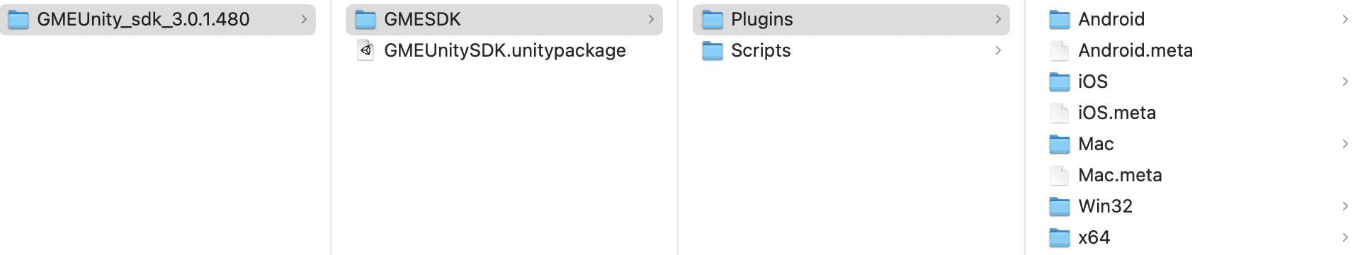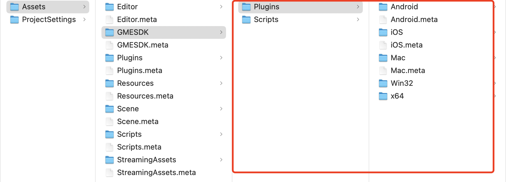 将开发工具包中 GMESDK 文件夹中的文件复制在 Unity 工程 > Assets文件夹中,如图所示。