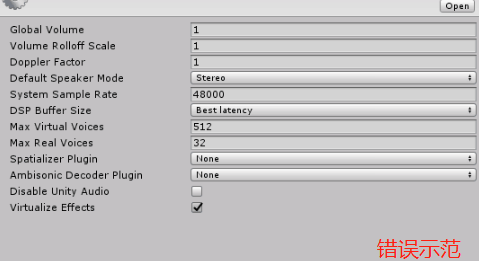 在 Unity 编辑器中,单击 Edit > Project Setting > Audio 使用系统默认即可。如果进行修改,Unity 播放音效会因为在 iOS 上设置硬件缓存区受影响,表现为音效被打断。如图所示: