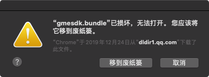 在 MacOS Unity 集成 GME SDK,执行运行操作时报错显示文件已损坏,原因为 com.apple.quarantine 属性导致:
