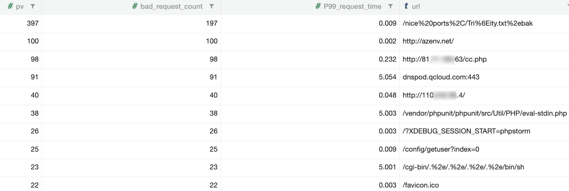 执行语句 | * | select count(*)as pv, count_if(status>=400)as bad_request_count, approx_percentile(request_time,0.99) as P99_request_time,url group by url order by pv desc limit 10 |