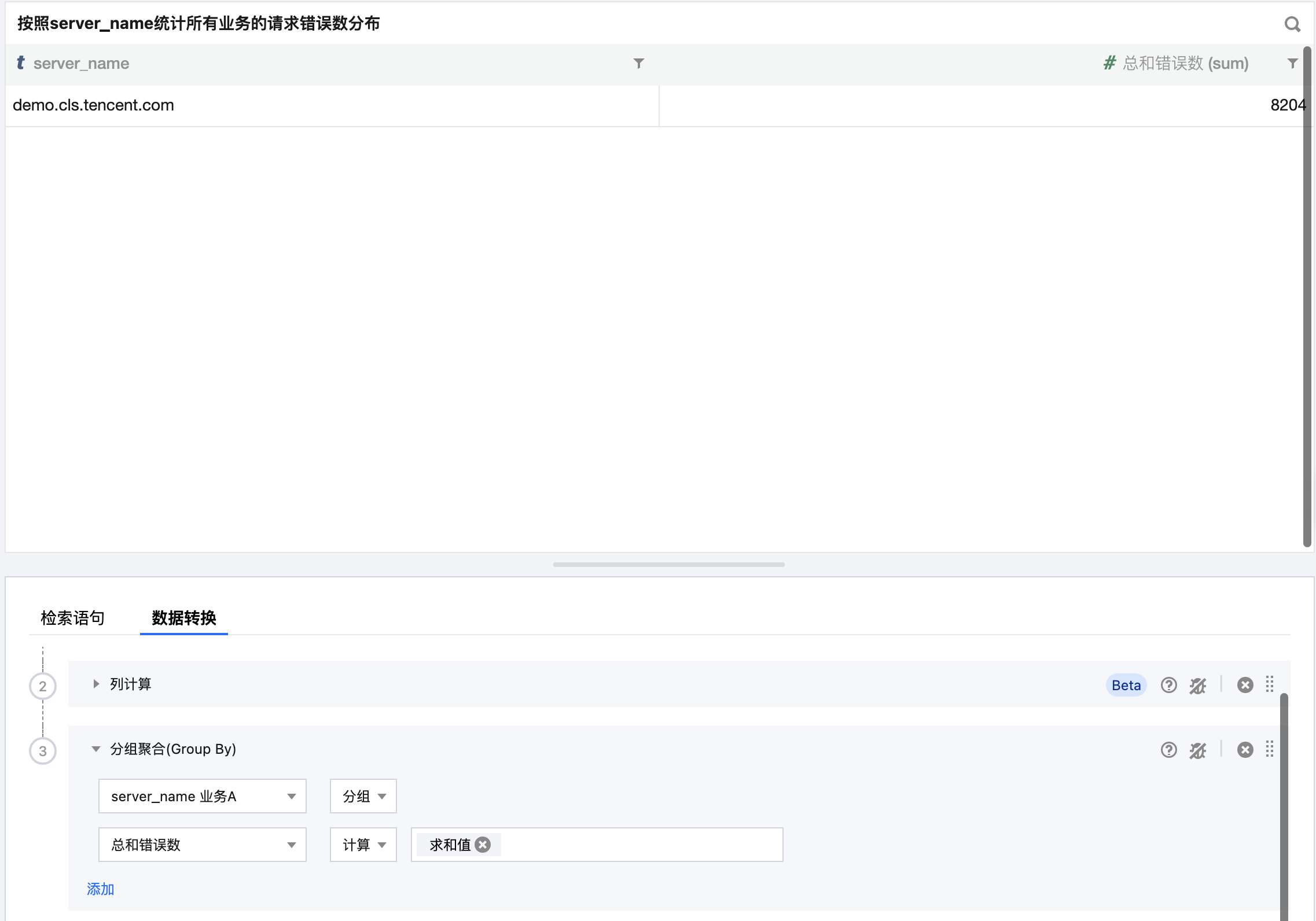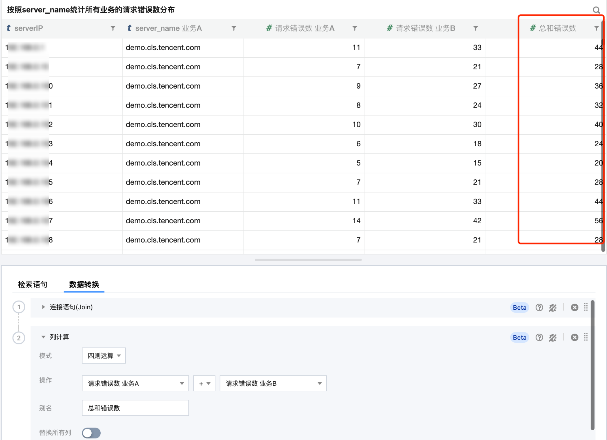 步骤3:添加数据转换--列计算,计算每个 serverIP 上业务 A、业务 B 的请求错误总和。