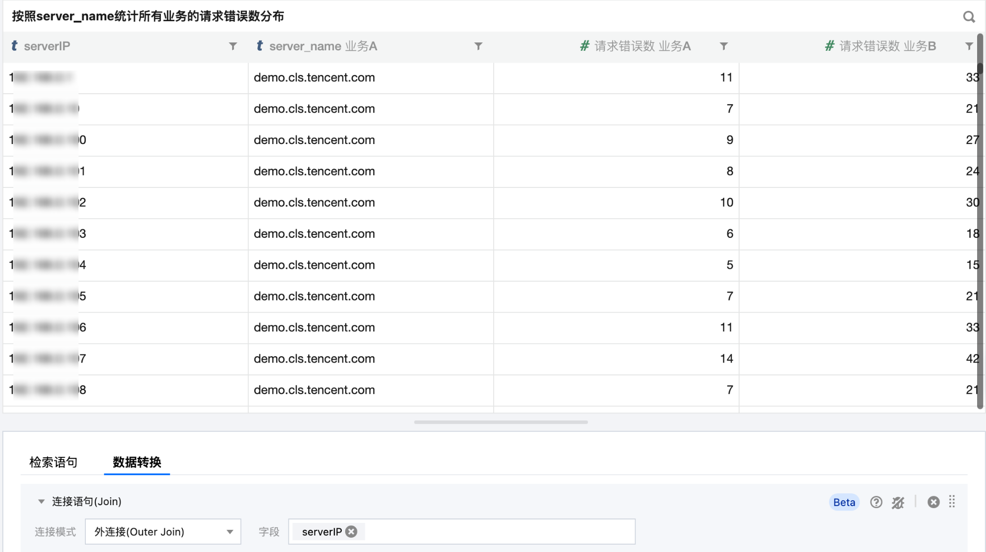 只有 A 业务主题有 server_name 字段,B 业务没有该字段,此外 A、B 业务均有服务端的 IP 字段可以关联 server_name。