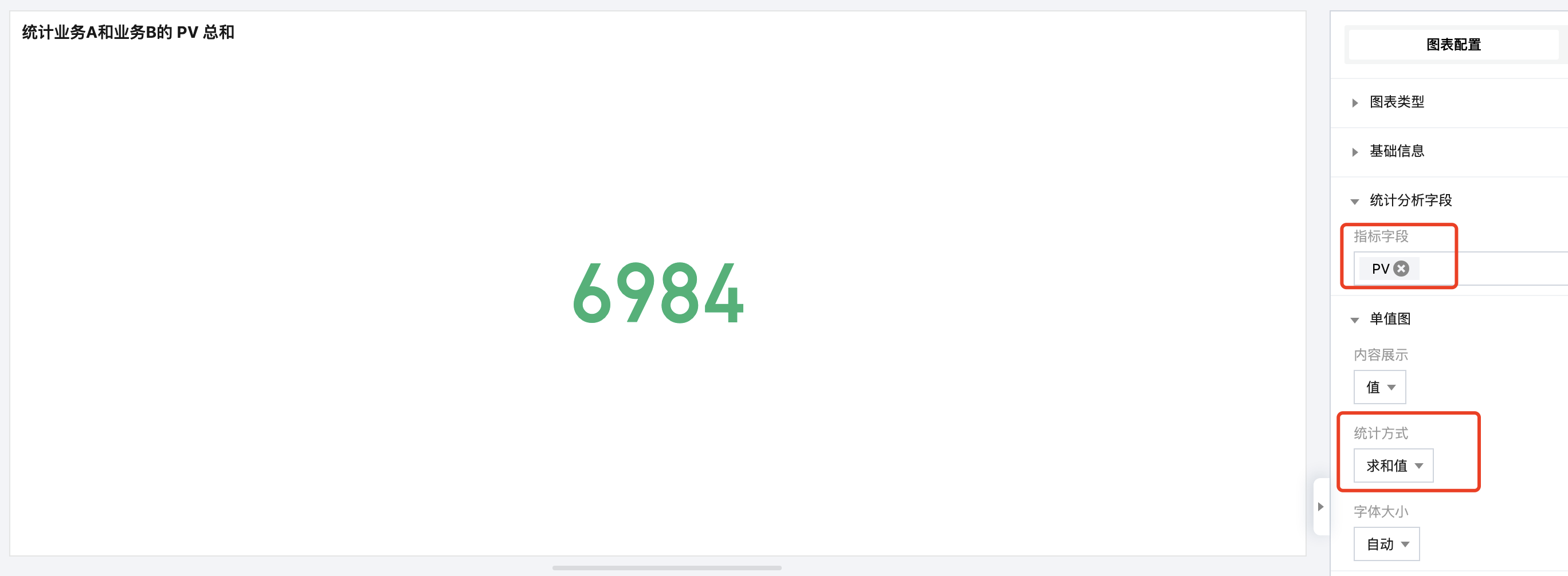 步骤3:单值图选择统计指标 PV,统计方式为对 PV 求和,得到两个业务的 PV 总和。