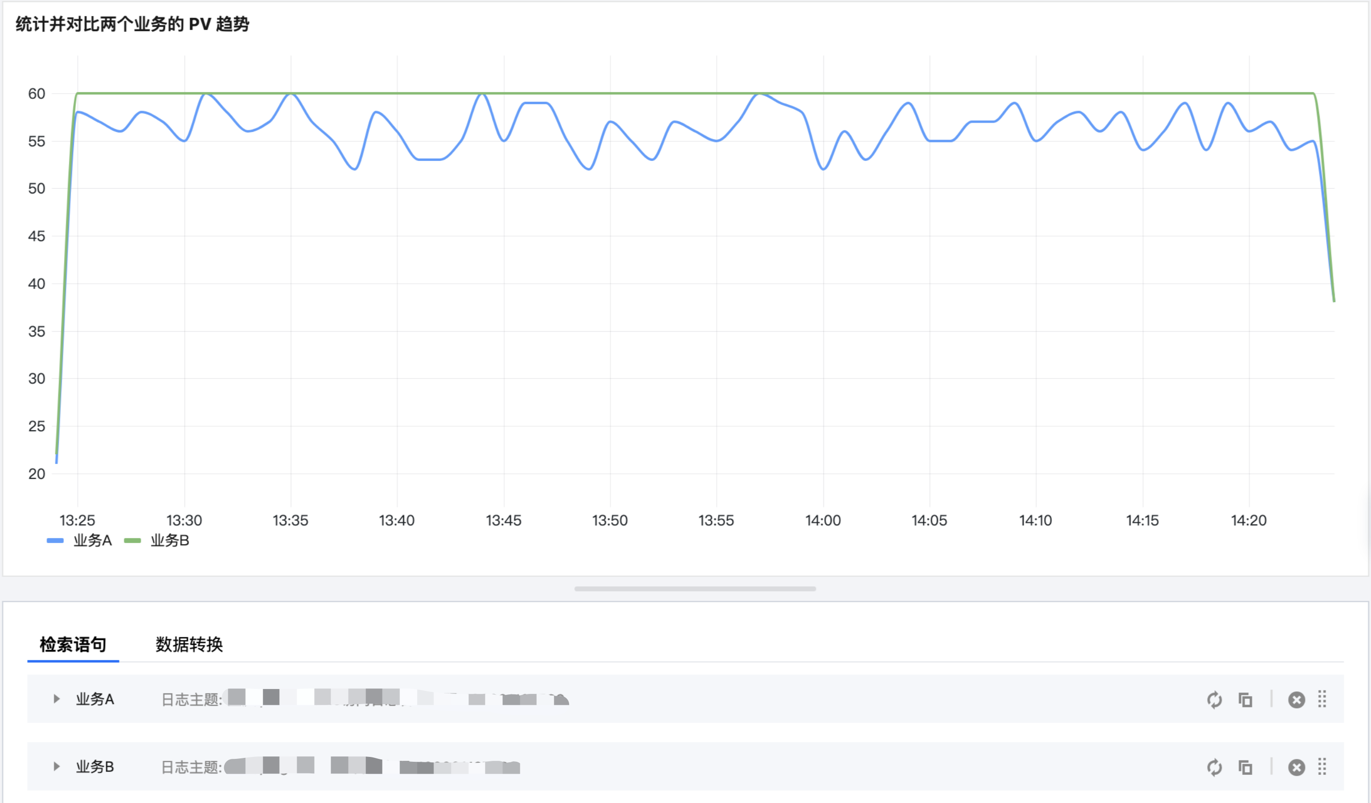 当前有 A、B 两种业务服务。两个业务的访问日志分别保存在 A、B 两个日志主题。存在统计分析需求,详见以下内容。