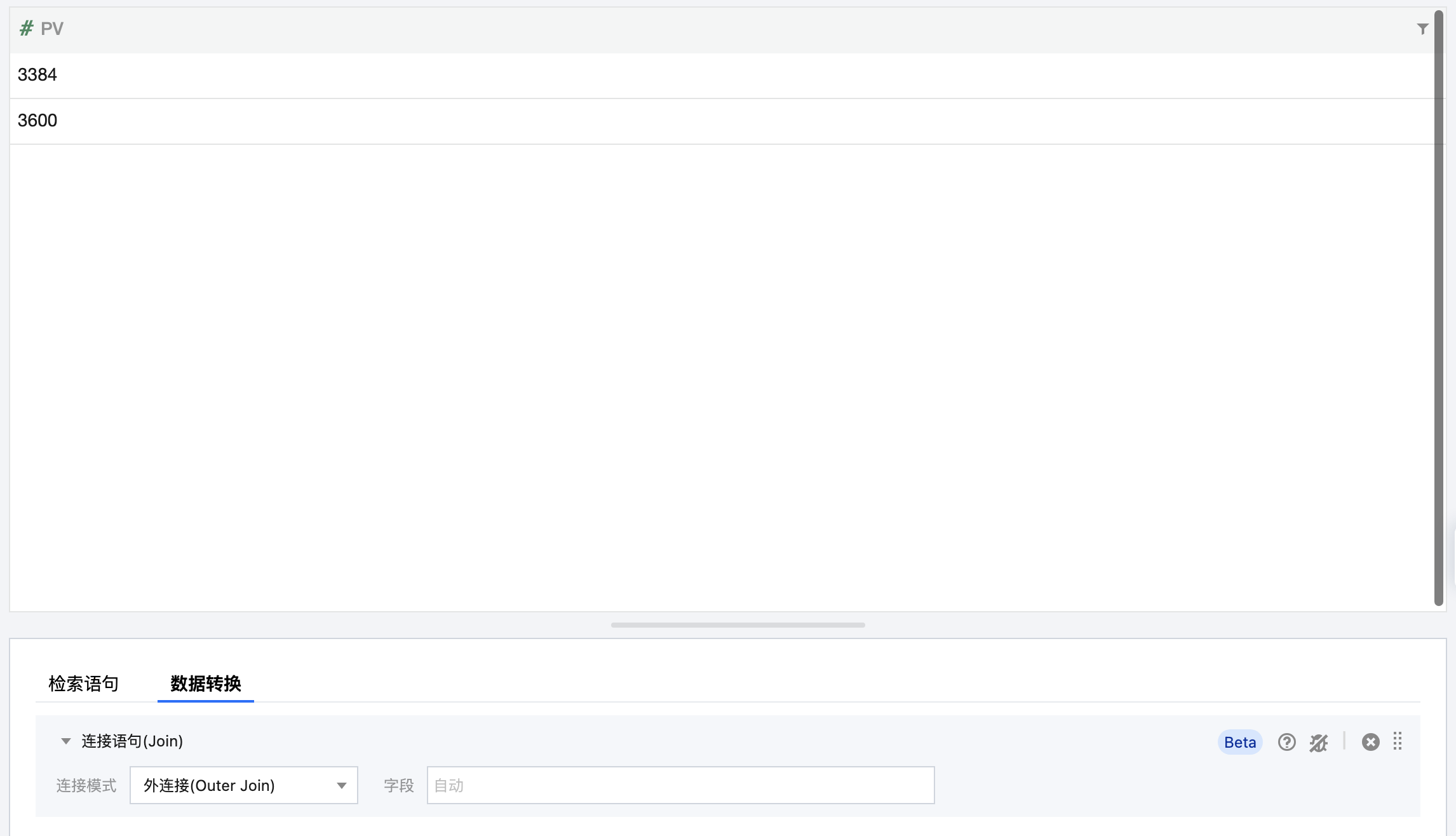 步骤2:添加数据转换--连接语句(JOIN),选择外连接,合并两个语句的业务 PV 在一张表里。